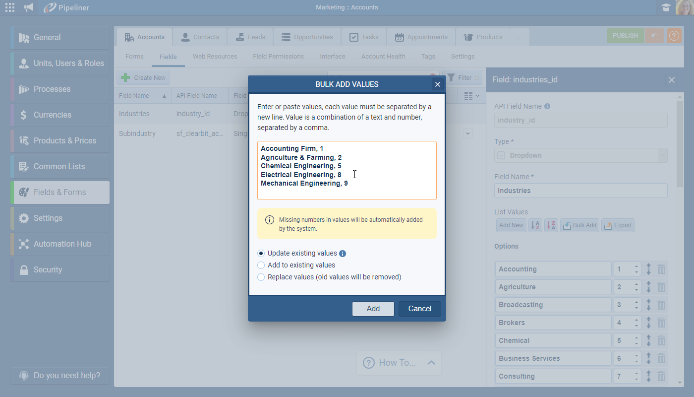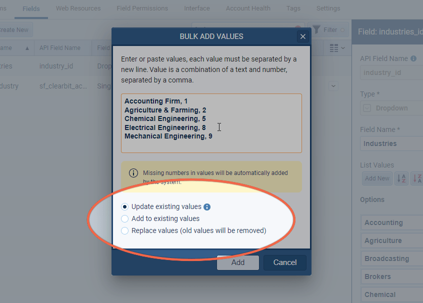 When importing values, for Dropdown and Radio fields, paste the values with the text followed by a comma and then the sort order number and each value must be on a new line. If “Update existing values” is selected, ensure that the order of the pasted values and the associated number exactly match the current sort order of the existing values in order to update them. Any pasted value that does not match an existing value based will be appended to the list.