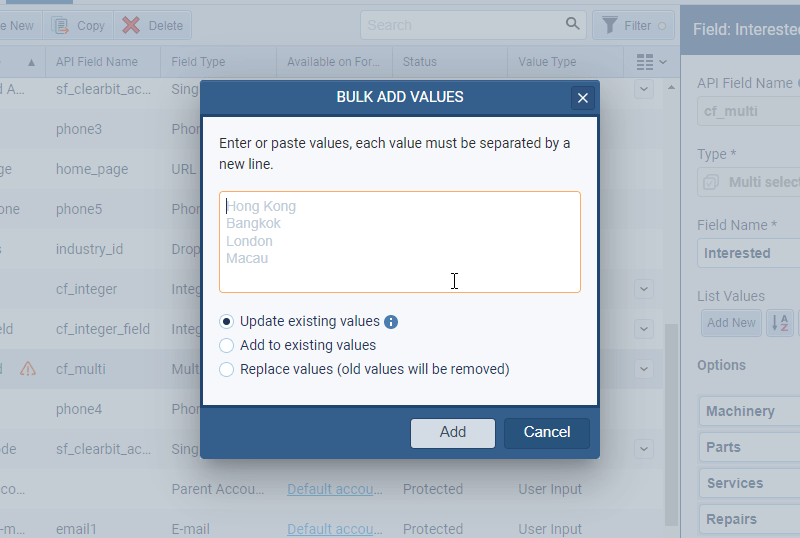 Clicking on the “Export” button will export all current values from the field to a .CSV file which can then be amended and re-imported using “Bulk Add”.