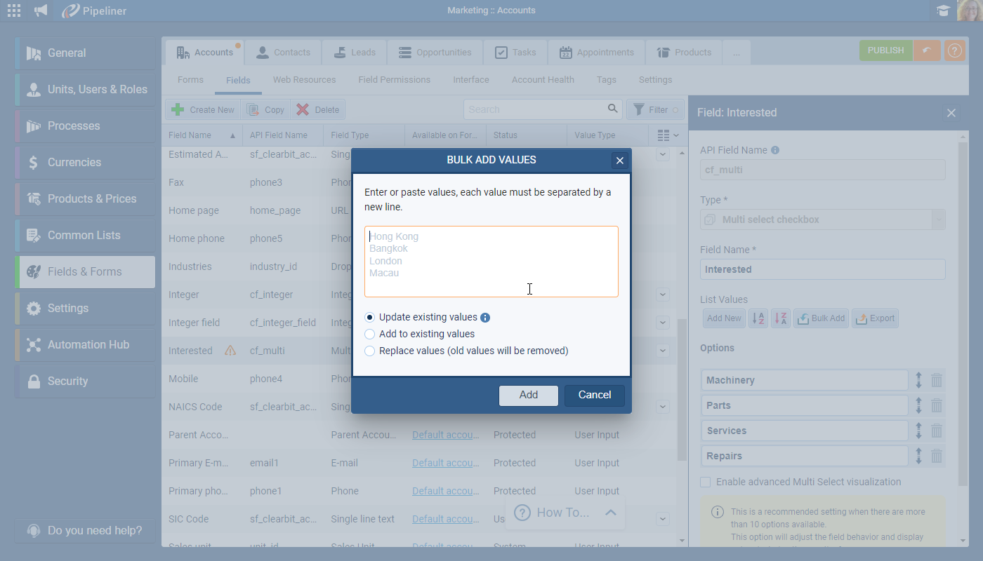 Selecting “Replace values” results in all existing values being removed and new values added ⤵