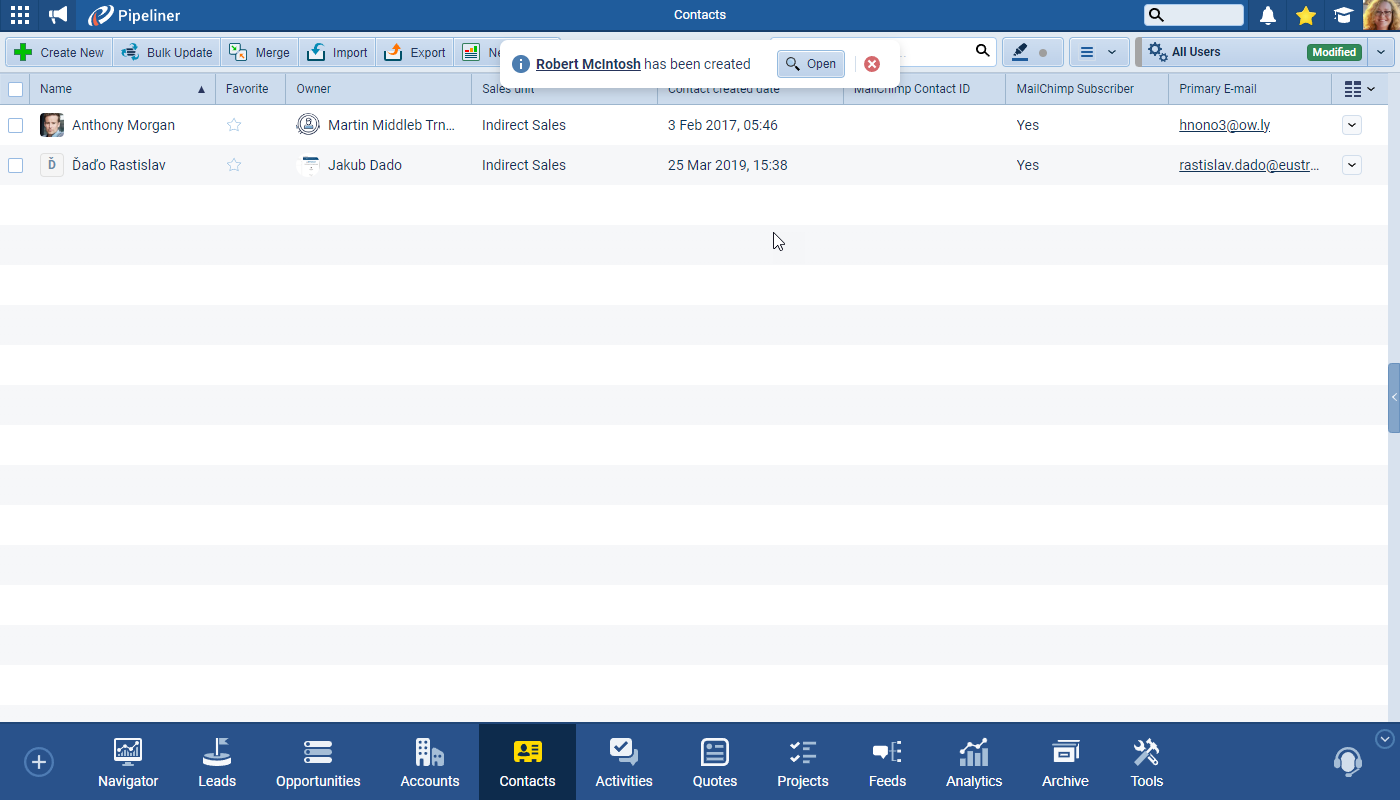 Once a new record has been created by clicking on the “Create” button (rather than “Create & Open”), a new notification banner will display. Users can click on either the hyperlink or the “Open” button to jump straight to their new record ⤵