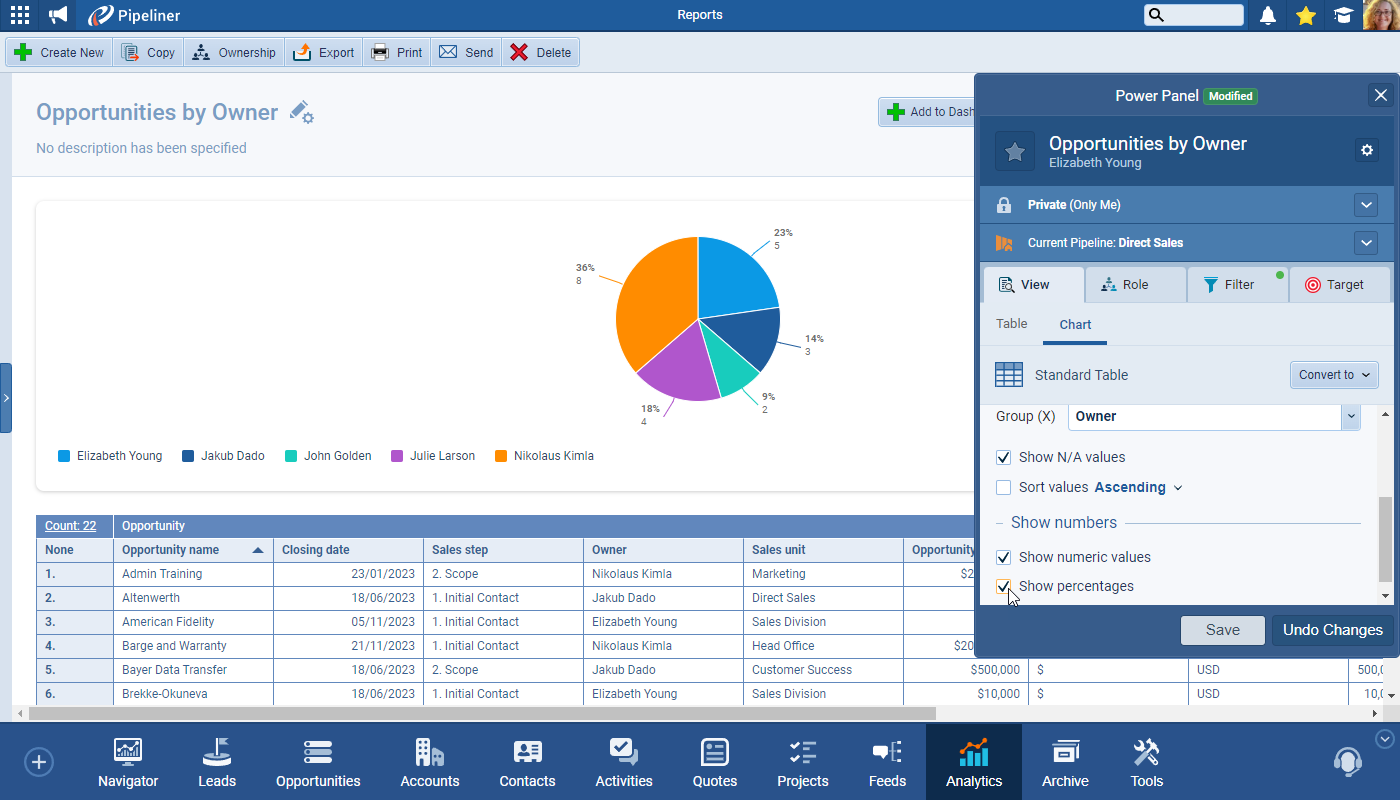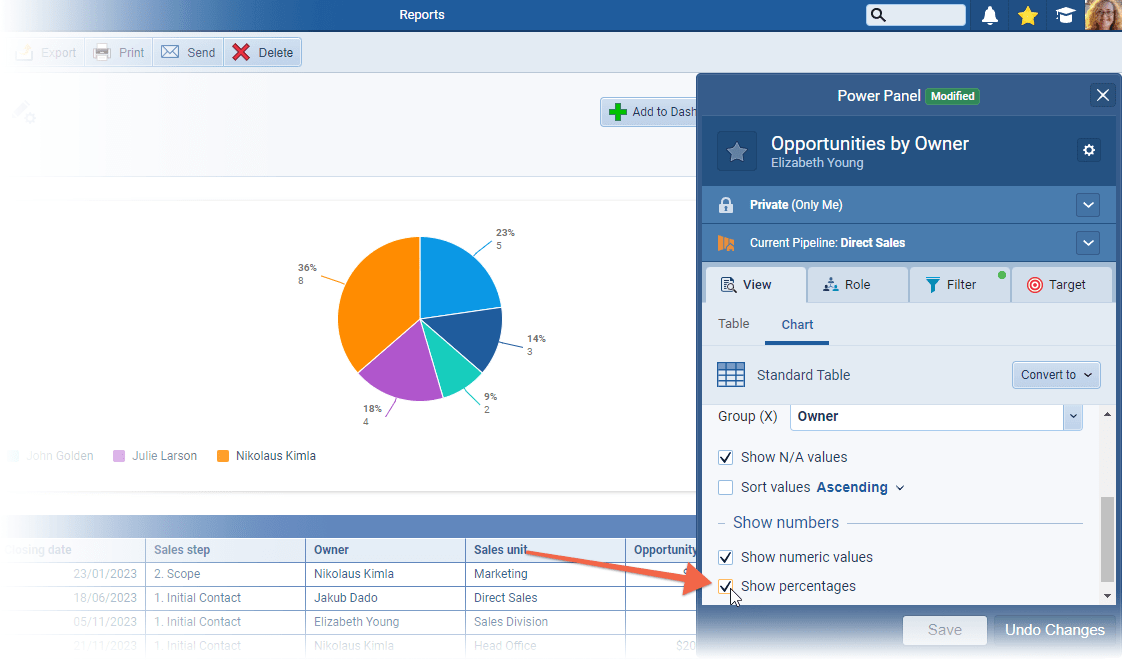 When using pie, column, multi-column or bar charts, users can now select “Show percentages” (as well as, or instead of, “Show numeric values”) ⤵