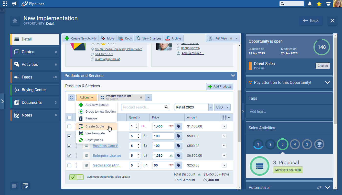 - Link follow up Activities directly to each Quote and see them in the Activities menu and the Feeds menu.