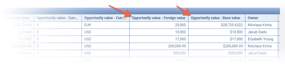 When currency fields are included in reports — for example, by selecting “Opportunity Value” — all currency fields will be displayed (and exported) ⤵