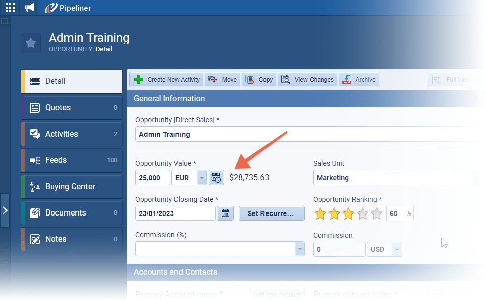 - Opportunity value › the value of the Opportunity converted to the selected system Base Currency amount