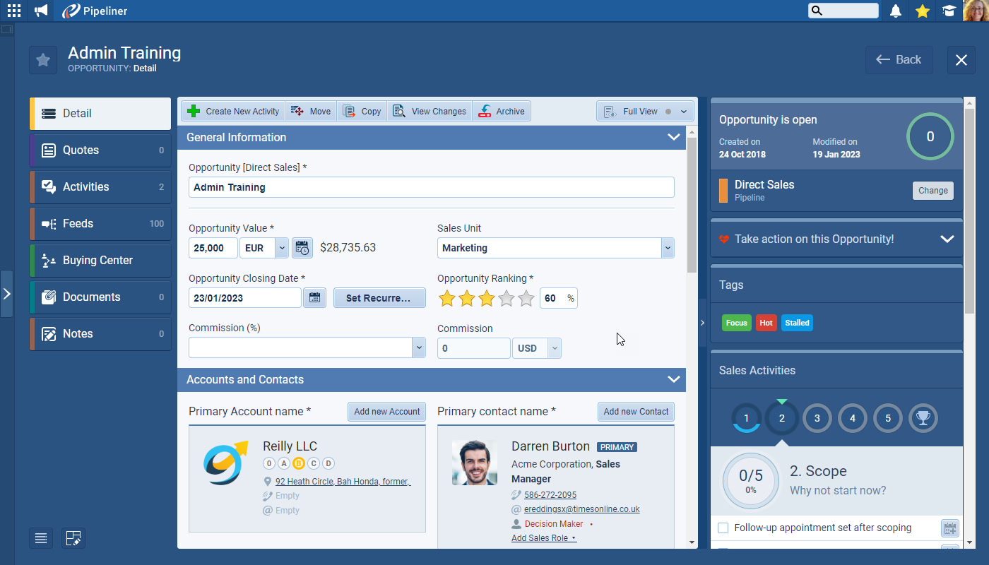 - Link an individual Quote to an Opportunity as well as an AccountAccount Account refers to a record of primary and background information about an individual or corporate customer, including contact data, preferred services, and transactions with your company. and Contact(s).