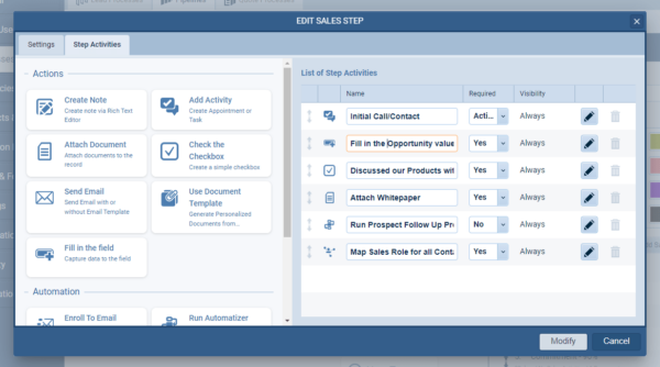 By adding a Sales Activities Checklist to each step of the PipelinePipeline Sales pipelineis a visual representation of the stage prospects are in the sales process., Coevera Admins can assist teams by providing step-by-step guidance using contextualized notifications which give specific suggestions on what actions users need to take in order to follow the company’s established process/strategy.