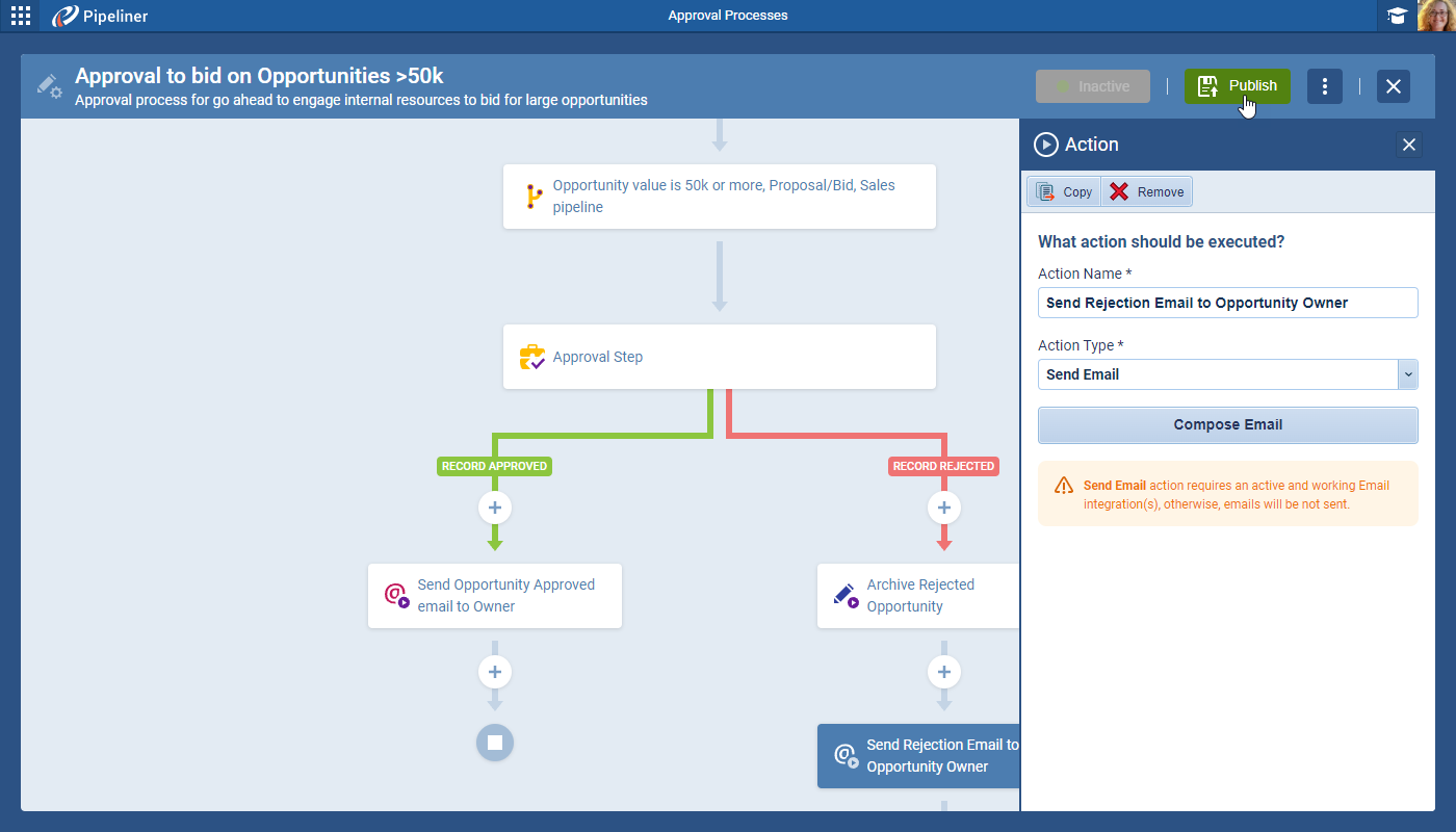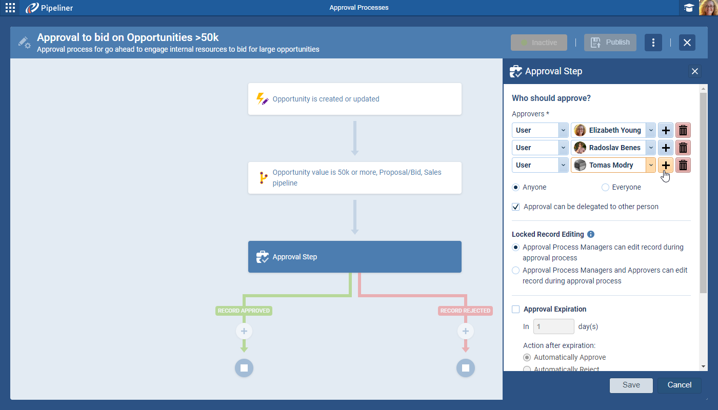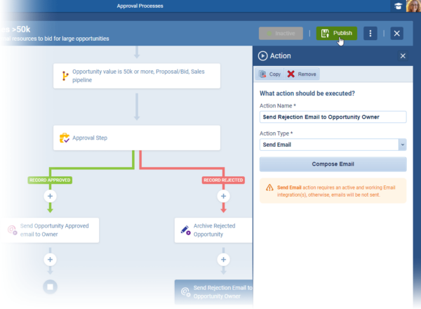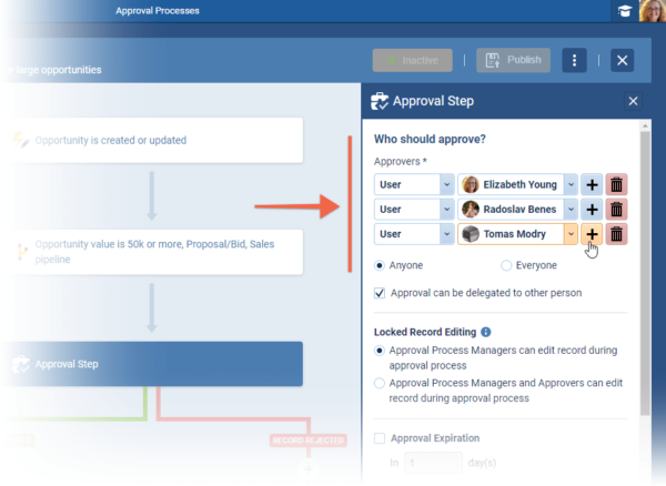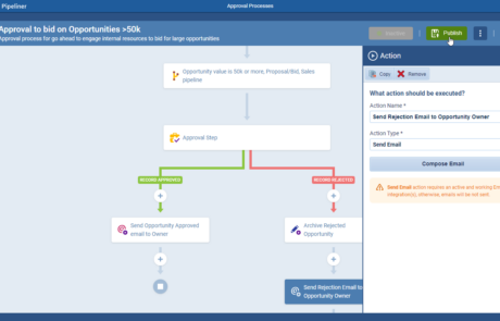 Much like in “Automatizer“, you can create multiple Actions that are triggered by “Approving” or “Rejecting” a record. Options also allow you to lock records while Approval is “Pending” as well as tie Approvals to your LeadLead Lead refers to a prospect or potential customer (who can be an individual or organization) that exhibits interest in your service or product; or any additional information about such entity., Opportunity, or Quote process so an unapproved Opportunity cannot be “Won” (for example). ⤵