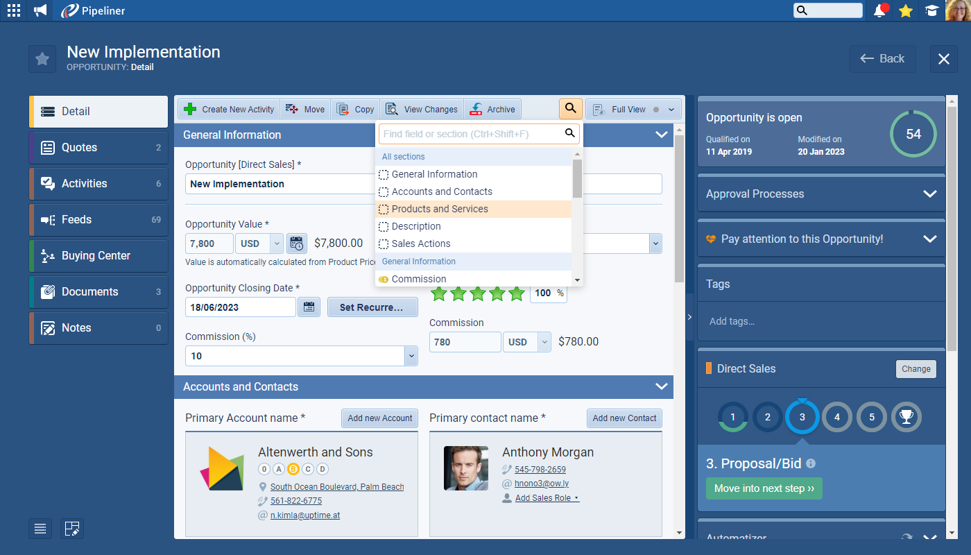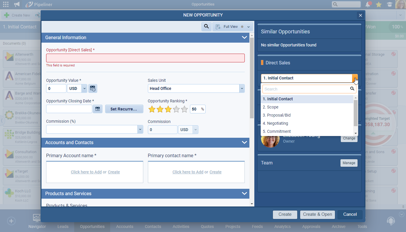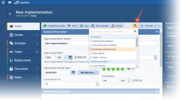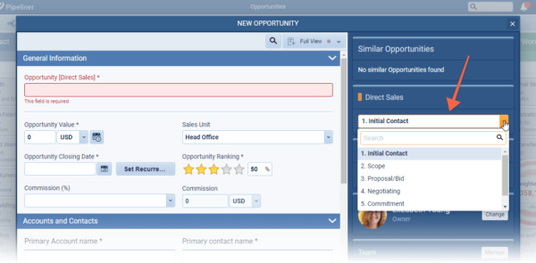 When creating new records for Leads, Opportunities, Quotes, users have a new option to select the step in which the record will be created. ⤵