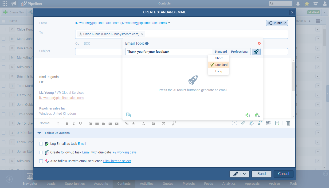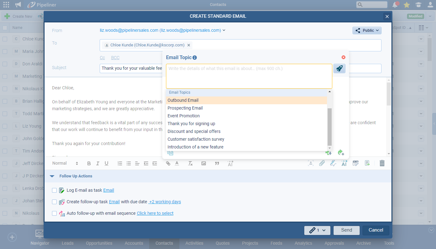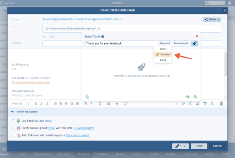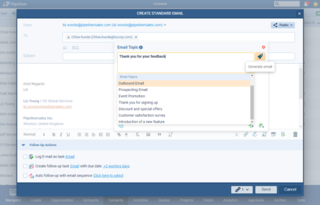 Based on one of the most advanced OpenAI models -the DaVinci model (text-davinci-003), users can now use our “Voyager AI Assistant” to help with creating fluent and creative business emails directly from within Coevera itself. This feature is available for Standard and Mass Emails as well as in Email Sequences and emails sent via Automatizer.