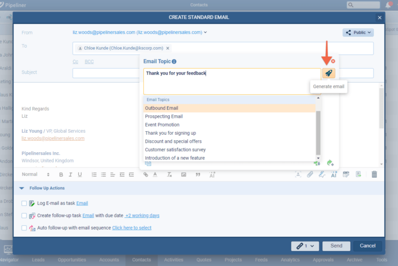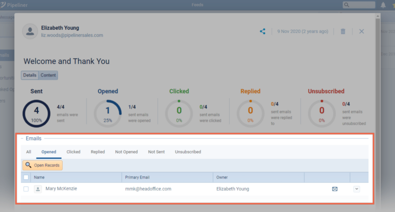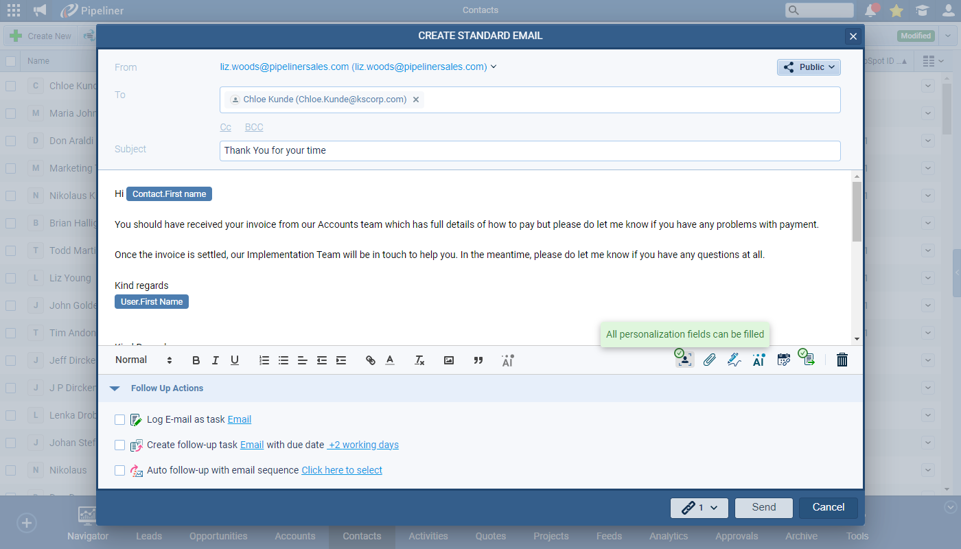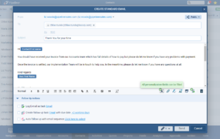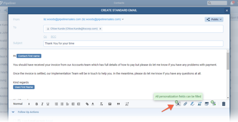 We’ve made some additional improvements to display the status of all personalization fields within any email. As well as being able to change which record to use to personalize an email, when an email is fully personalized, the user sees that all values are valid and the email can be immediately sent without a prompt whereas, when a record is missing a field value for personalization, the user can immediately see the problem field(s) and and will also get a prompt to fix before sending. ⤵