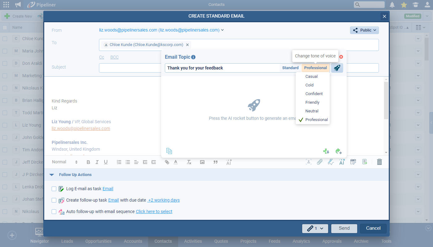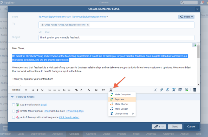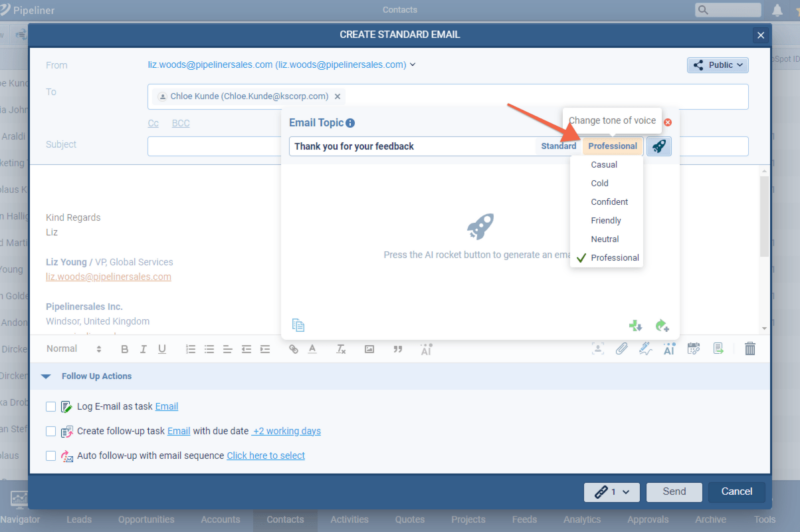 Options are available to change the tone of the email ⤵