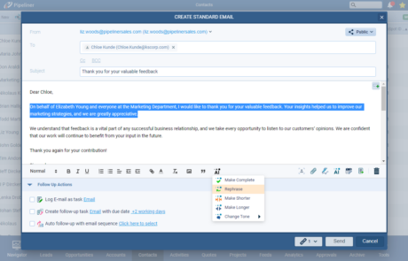 Users can also use AI to enhance existing email content. The Voyager AI Email Assistant will turn it into a fully finished and ready-to-send email using “Enhance & Complete” or “Rephrase”. Other options can “Make Shorter” or “Make Longer” or change the tone of the content. ⤵