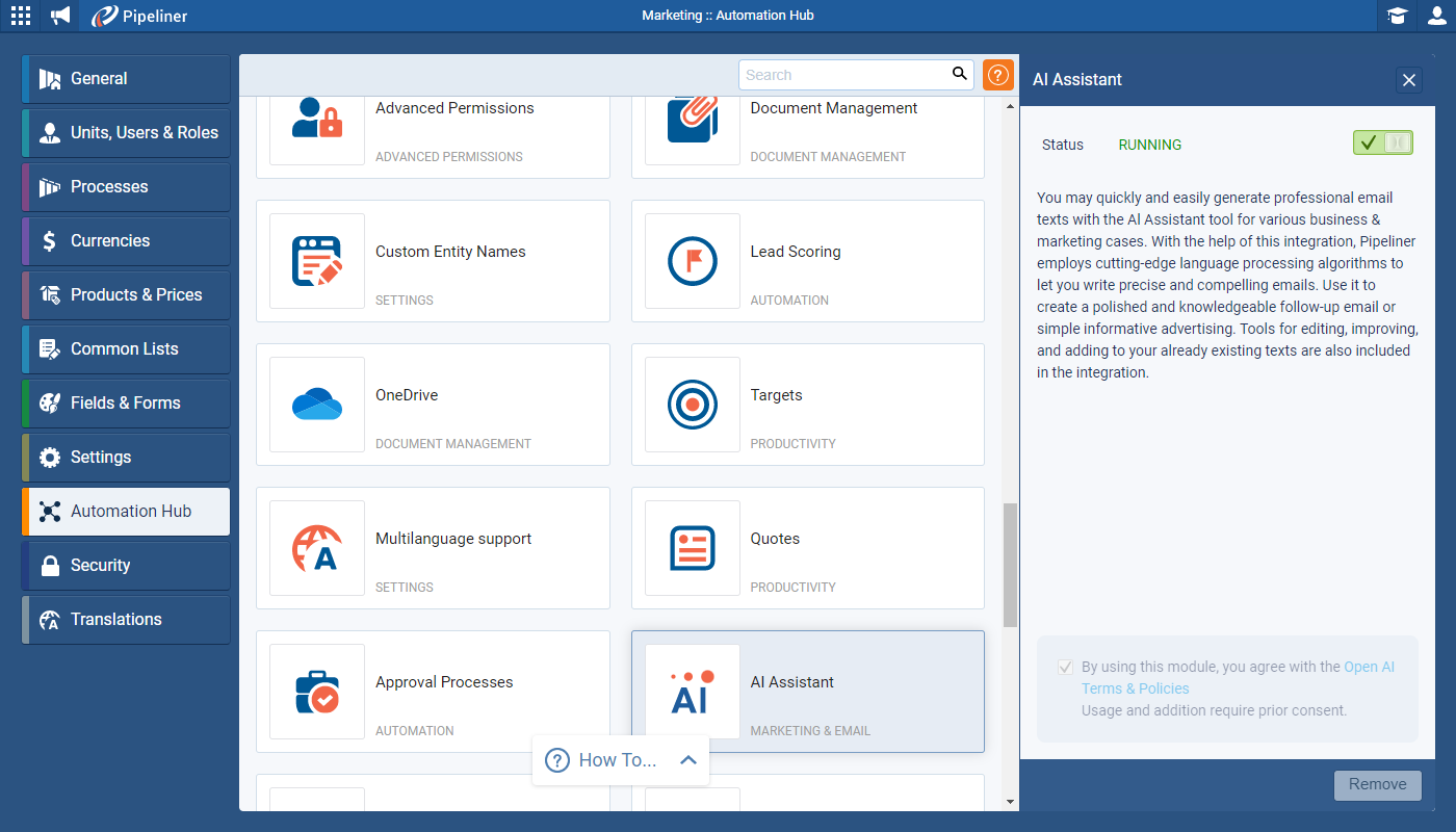 This new feature is available free-of-charge to all customers. One of your Coevera Admins will need to enable it from the Automation Hub and will need to agree to the OpenAI Terms and Conditions before it will be activated. ⤵