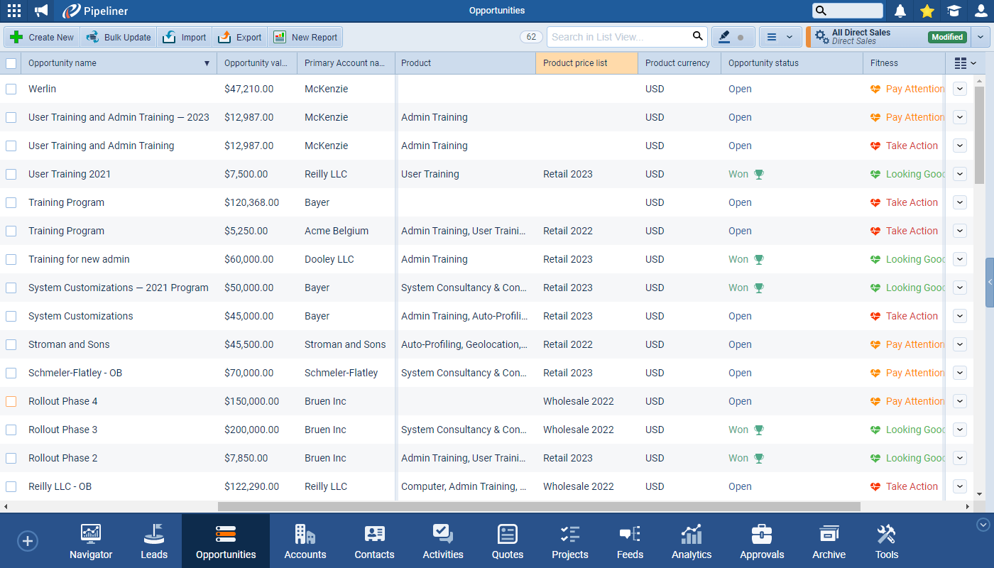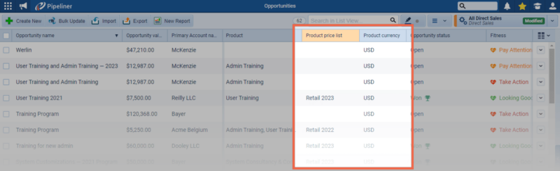 Two new fields — “ProductProduct Product refers to anything (an idea, item, service, process or information) that meets a need or a desire and is offered to a market, usually but not always at a price. Price List” and “Product Currency” — are now available and can be used in List Views, Reports, Filters, Exports and Document Templates. ⤵