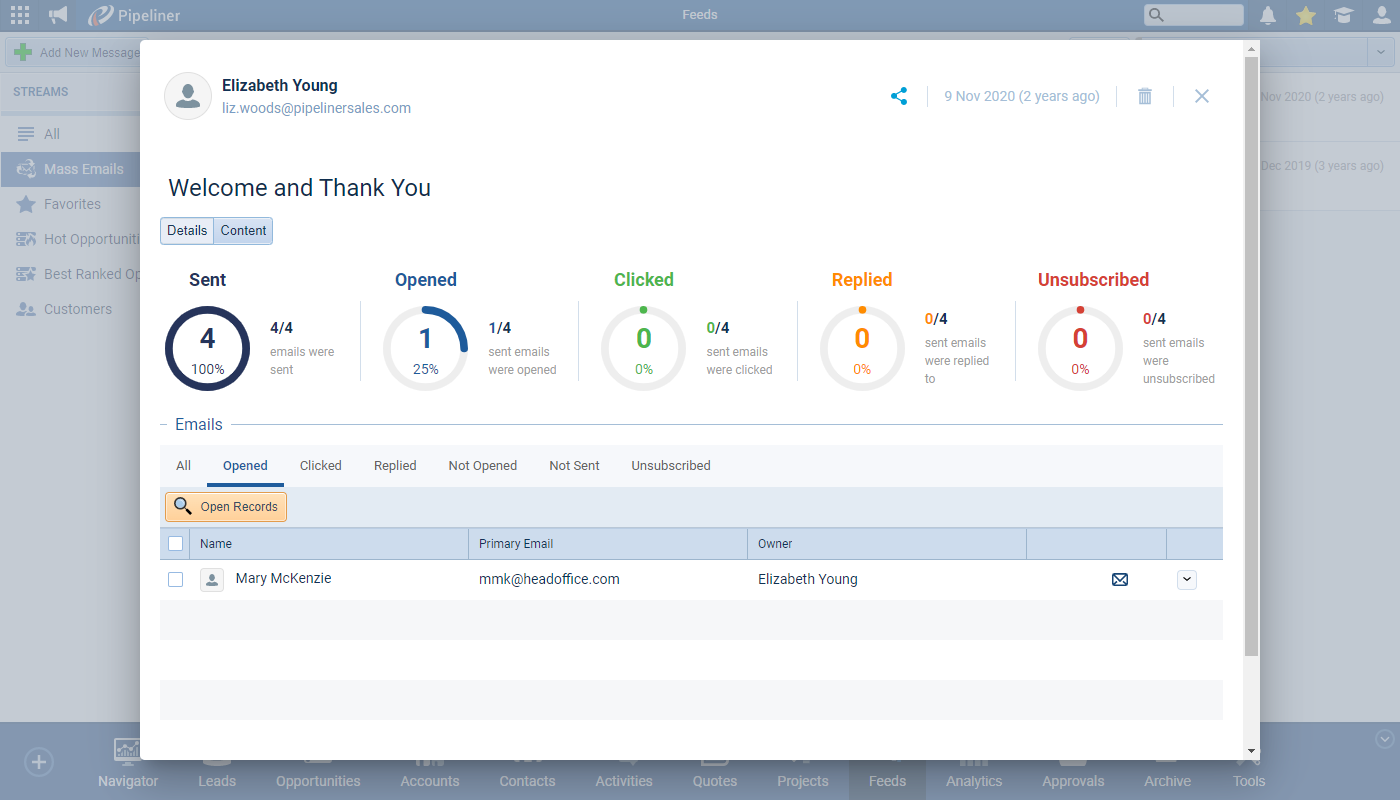 We’ve added a drilldown option to the Mass Email Statistics report tabs. You can now use “Drilldown” to open a list of those recipients who have opened, clicked or unsubscribed from a Mass Email. From the list, you can select the columns to view as well as export, bulk update, tag or trigger an Automatizer process. ⤵