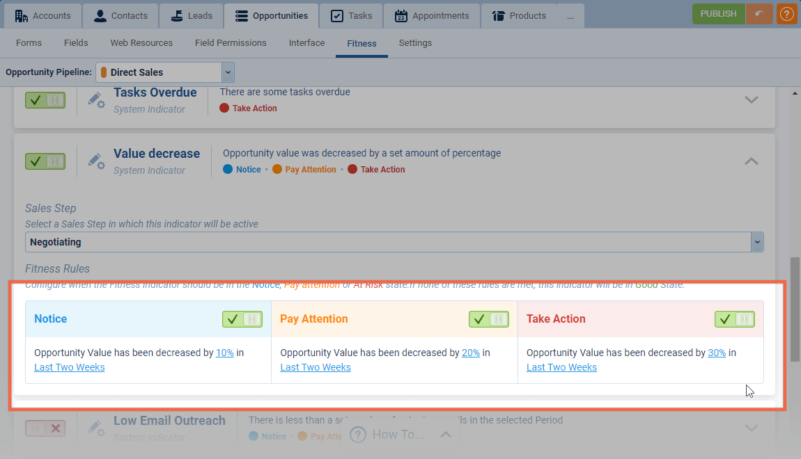 Every indicator has its own set of rules. Rules determine the Fitness of the Indicator and then contribute to the overall Fitness of the Opportunity. Fitness Rules are always calculated in order — At “Risk” → Pay “Attention” → “Notice“. If the rule is matched, then the Fitness Indicator is assigned the corresponding label for the rule.