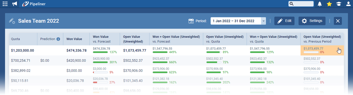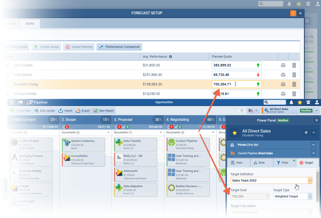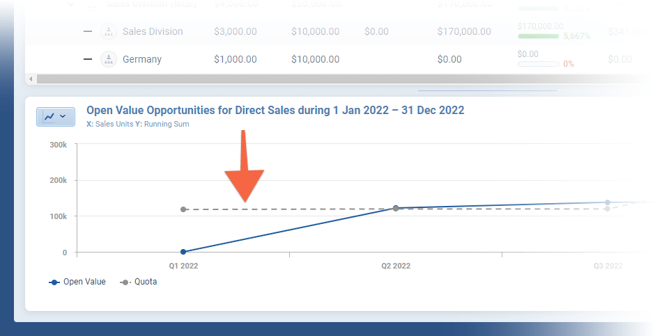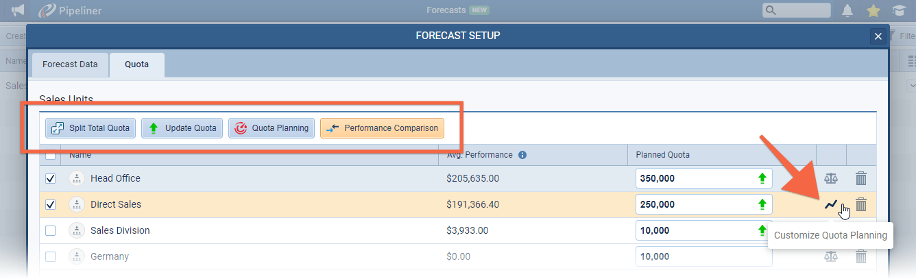 As part of your Forecast set up, on the QuotaQuota Quota is a predefined benchmark indicating the amount of sales a selling unit such as a sales rep or a regional sales team should achieve within a given period, often used as a measure of success, performance and eligibility for commissions and other rewards. Tab, you can enter Quotas for Users/Sales Units etc based on splits, previous performance or manual custom values ⤵