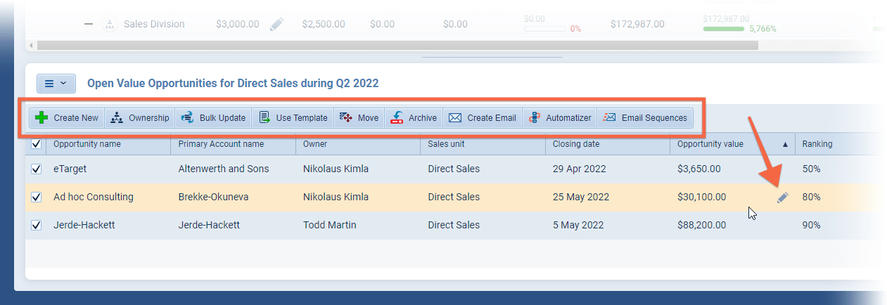 The “List View” can be customised and allows inline editing. The data is fully actionable — you can update Ownership or send Emails or even run an Automatizer process or create a new Opportunity ⤵