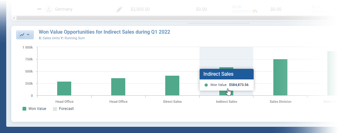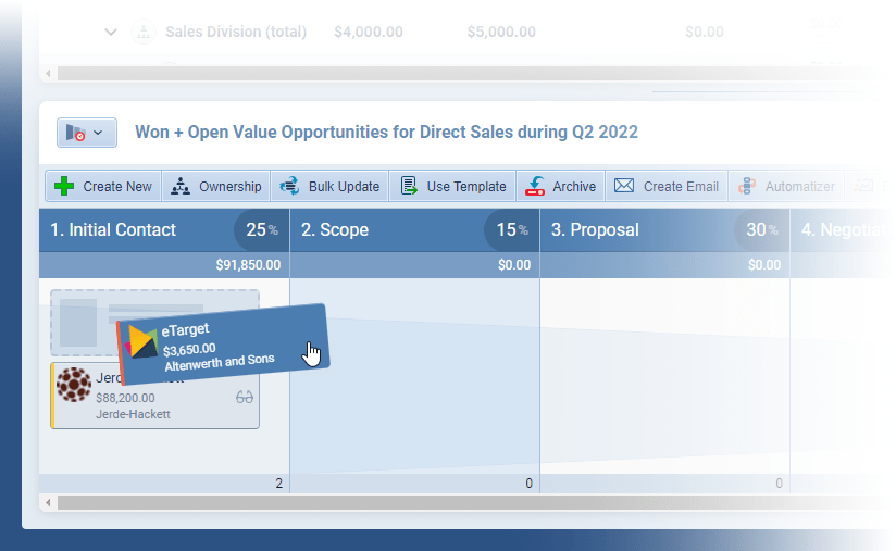 The “PipelinePipeline Sales pipelineis a visual representation of the stage prospects are in the sales process. View” shows you where Opportunities are in your process. Opportunities can be opened and moved directly and your Forecast data will, again, update in real time ⤵