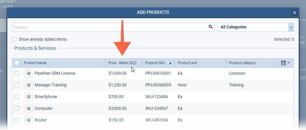 In another really useful enhancement to using Products, you can see the price from the Price List you’ve selected for this Opportunity when you add Products via the Product selector ⤵