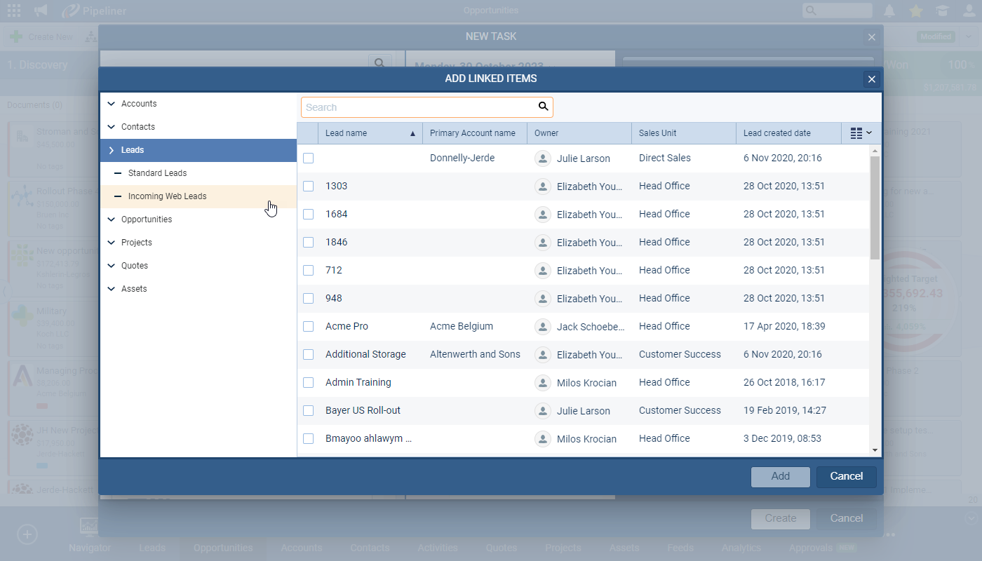When it’s possible to add multiple entities of different types — e.g. when adding multiple Linked Items to an “Activity” — the left hand panel will display all Entities and also all “Types” (Types of Contact, Opportunity Pipelines, LeadLead Lead refers to a prospect or potential customer (who can be an individual or organization) that exhibits interest in your service or product; or any additional information about such entity. Forms, for example). Users can select multiple records of different types at once. ⤵