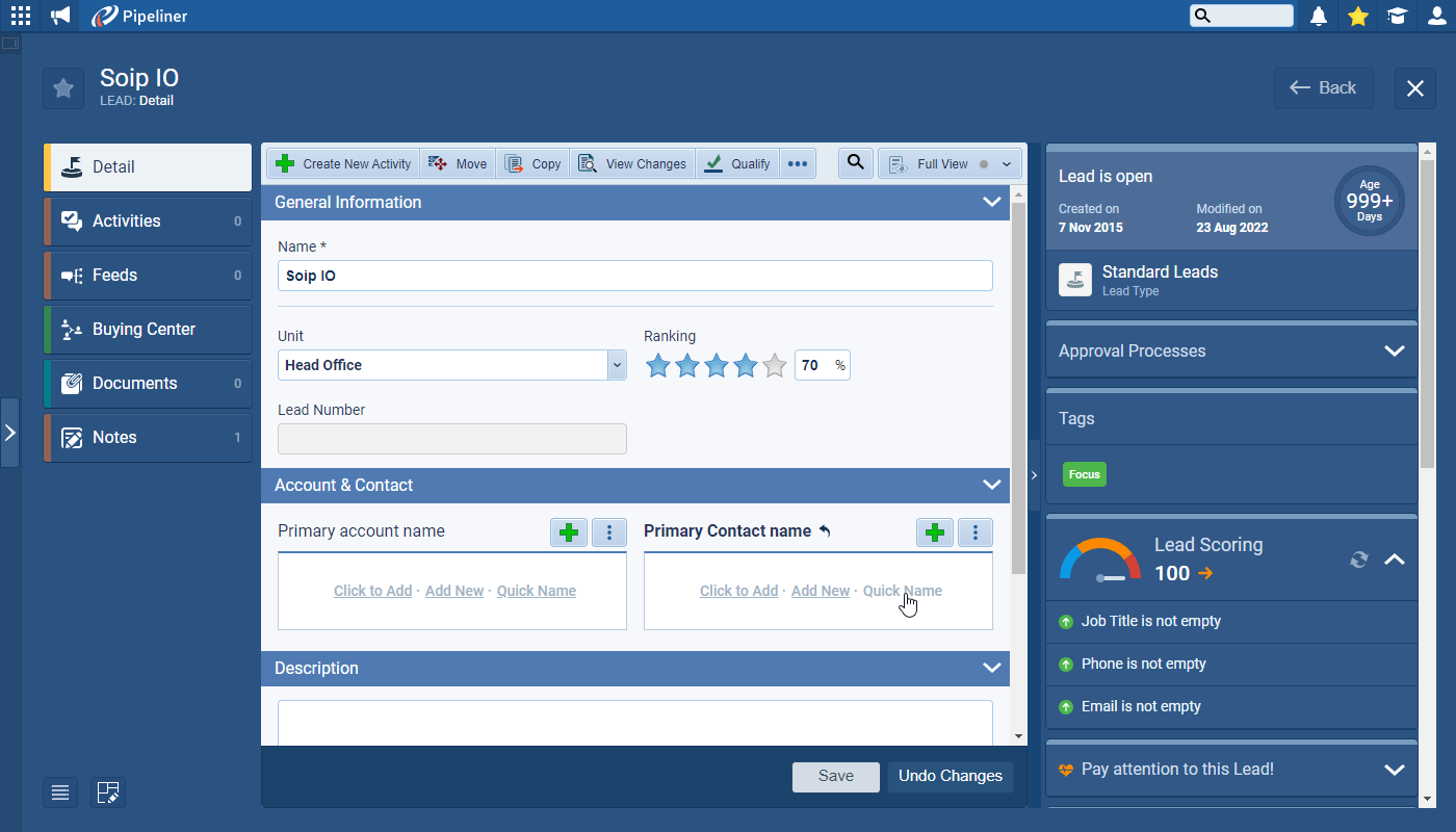 When working with “Leads“, for example, when confirmed data might not be known yet, the “Quick Name” options are still available to capture unverified information which you want to check prior to creating an Account or Contact. ⤵