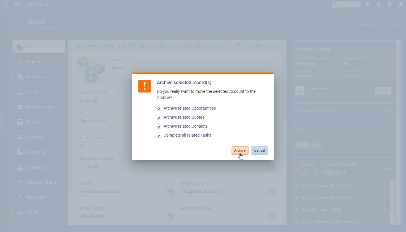 When archiving an Account or Contact, the user is also prompted whether to also Archive (or Complete) related records. If there are related Leads, Opportunities, Contacts or Quotes, the prompt will be to Archive these whereas if there are linked Activities or Projects, the prompt will be to complete them. ⤵