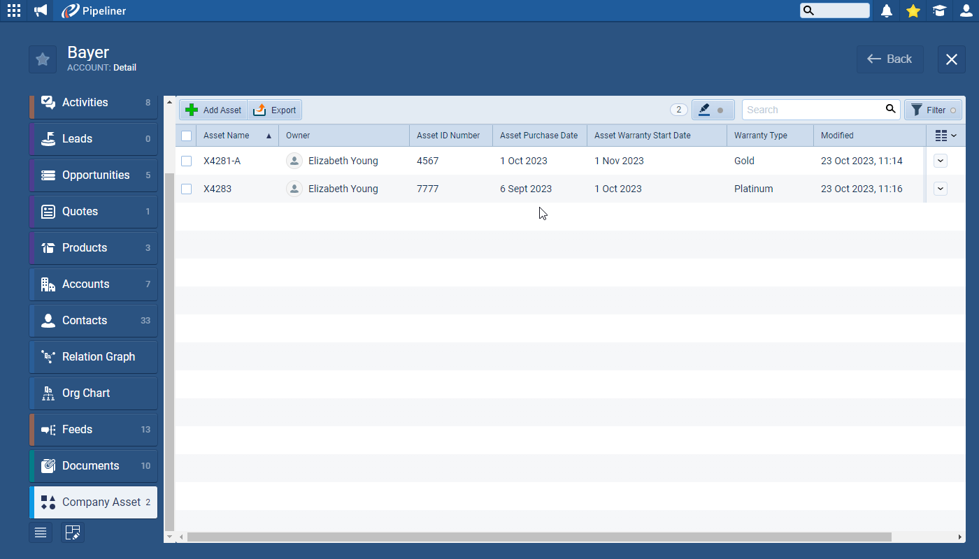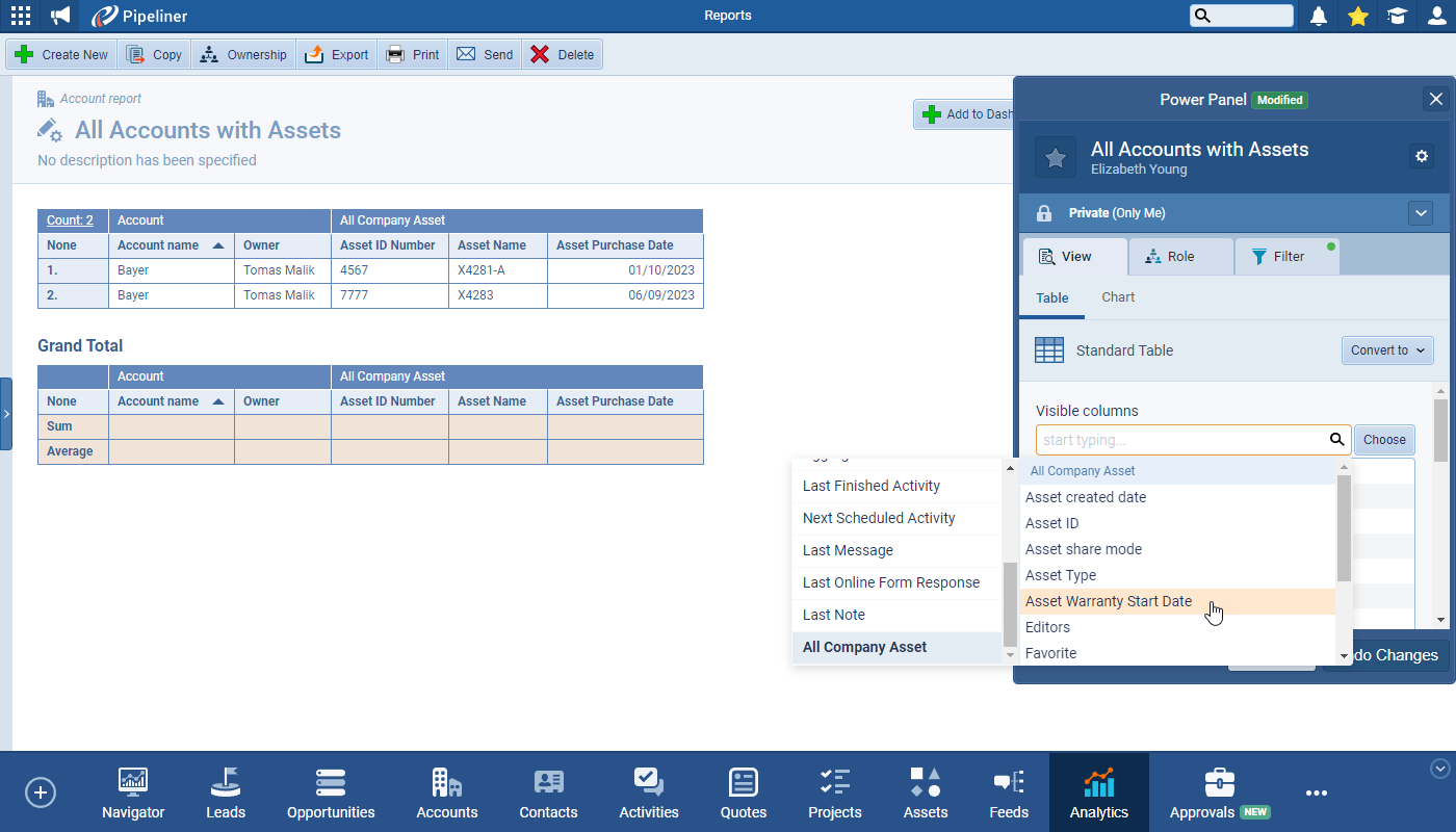“Reports” and “Filters” based on “Custom Entities” can now include fields belonging to “Linked Entities” — examples would be the ability to filter a list of Accounts based on them having particular Assets (where “Assets” is a “Custom Entity“) or to create an AccountAccount Account refers to a record of primary and background information about an individual or corporate customer, including contact data, preferred services, and transactions with your company. report and include columns for all information related to that Account’s Assets. ⤵