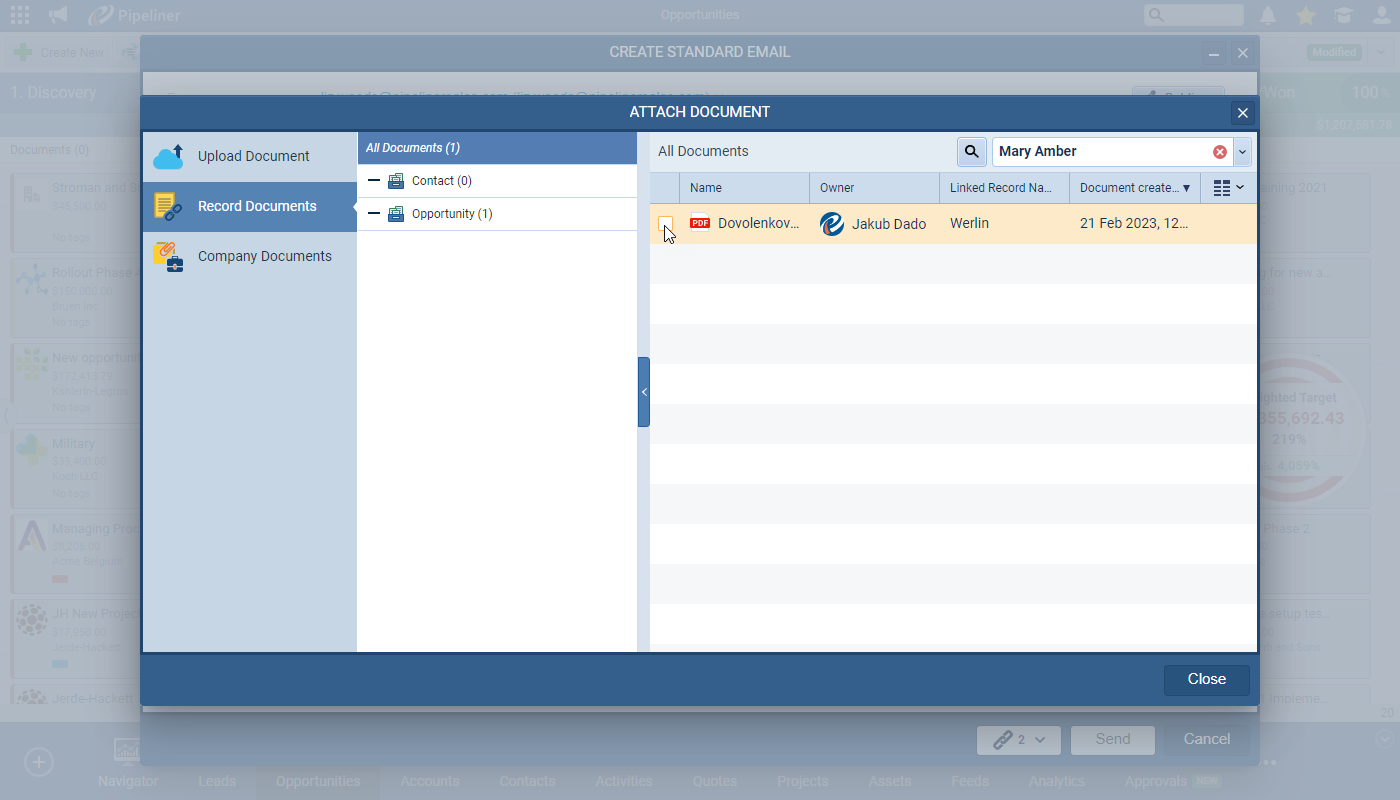 We’ve added “Record Documents” to the options available when attaching files to emails so users can access any file related to their selected record and click on it to attach directly to the email they are composing. ⤵
