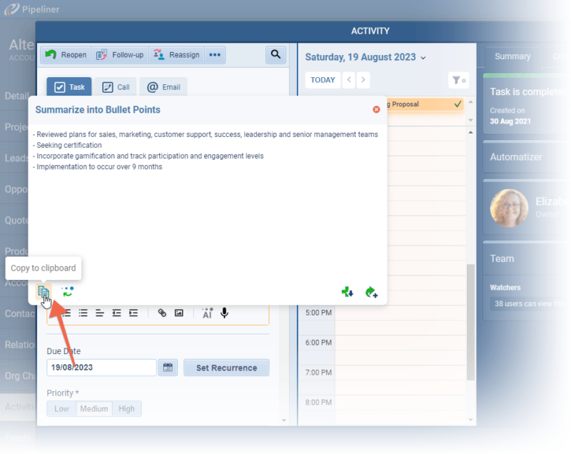 Once the AI Assistant has generated the contentContent Content refers to a material or document released in various forms (such as text, image, audio, and video) and created to inform, engage or influence specific audiences., users have some different options. They can “Copy to clipboard” so the text can be pasted into an email or into another app such as Word or Notepad ⤵