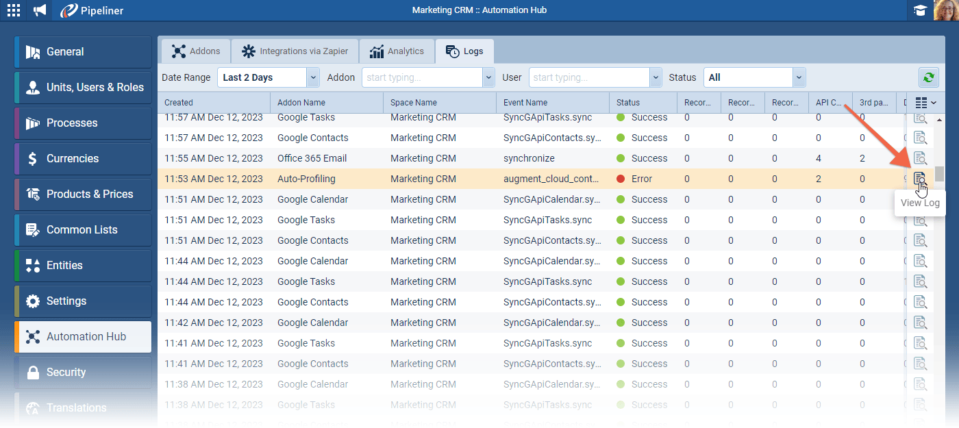 Click on “View Log” to see the specifics of each log run. This is extremely useful if you see any errors in the logs.