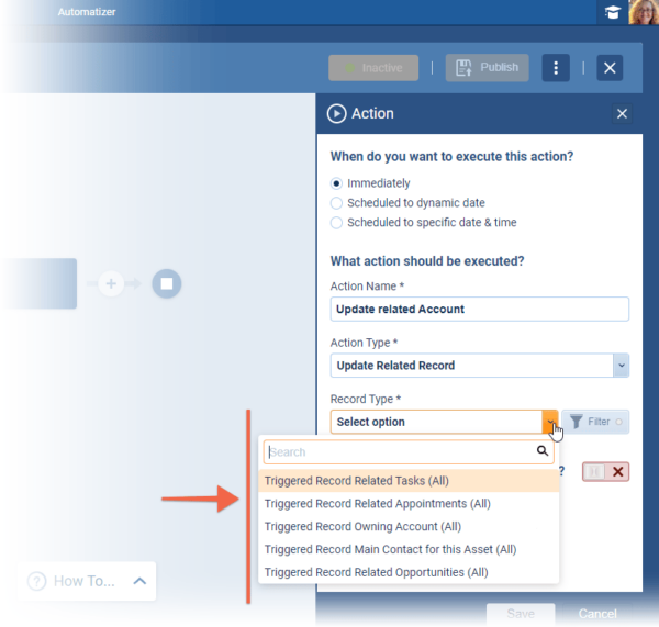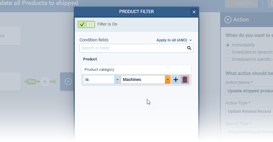 Users can now filter related records to be updated via an “Action” in an Automatizer process. Previously, the Action would update all related records of the selected type but users can now choose, for example, to update only certain types of Activity, specific ProductProduct Product refers to anything (an idea, item, service, process or information) that meets a need or a desire and is offered to a market, usually but not always at a price. Line Items or active Contacts. ⤵