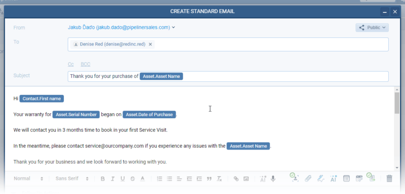 Users can send emails to “Accounts & Contacts” and link them to Custom Entities or send emails to all accountAccount Account refers to a record of primary and background information about an individual or corporate customer, including contact data, preferred services, and transactions with your company./contact lookups located on the custom entity or any other entity. Emails can also be personalized by any Custom Entity. ⤵