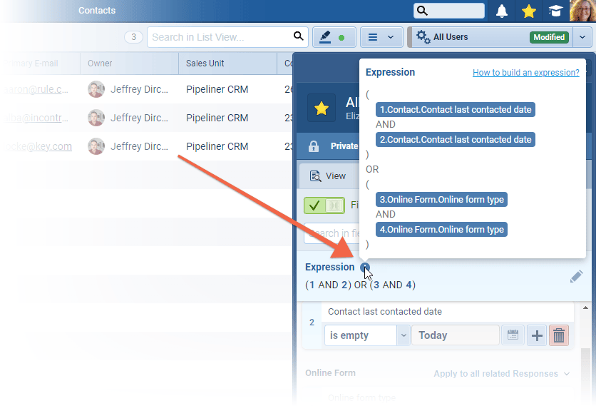Users create custom expressions by combining field numbers (note that each field has a number that can be referenced in the expression) with operators “AND” or “OR” and parentheses. Additional fields can be added to the filter but also must be explicitly included in the expression to affect the result. Fields highlighted in grey are not part of the expression, so are ignored when displaying the results. ⤵