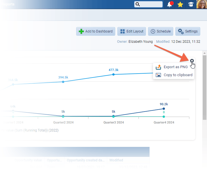 It is now easy to export graphs from dashboards and reports to add to a presentation, for example, or to paste into an email as an image. All chart types can now be copied to clipboard or exported as “.PNG“. ⤵