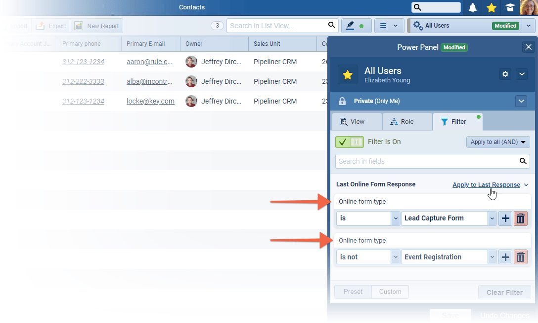 Data filtering has also been improved, as a field can be included in a filter more than once. As an example, this will allows users to filter “multi select checkbox” values more effectively by including one option but excluding another or by filtering a specific value in a field but also where that field is empty. ⤵