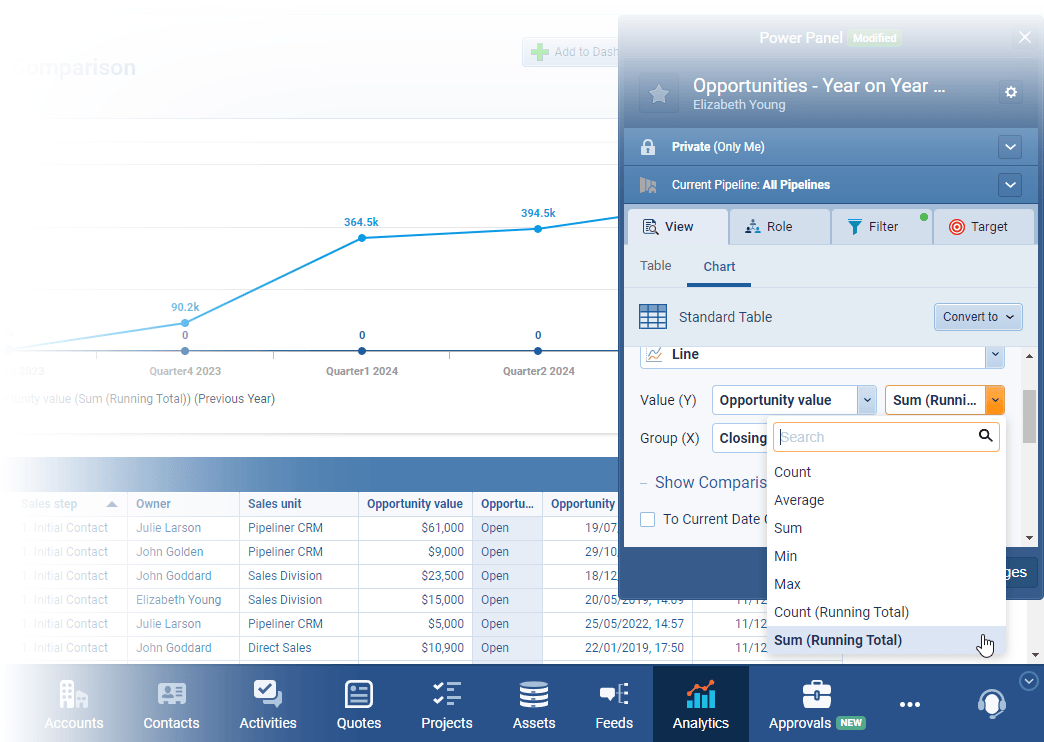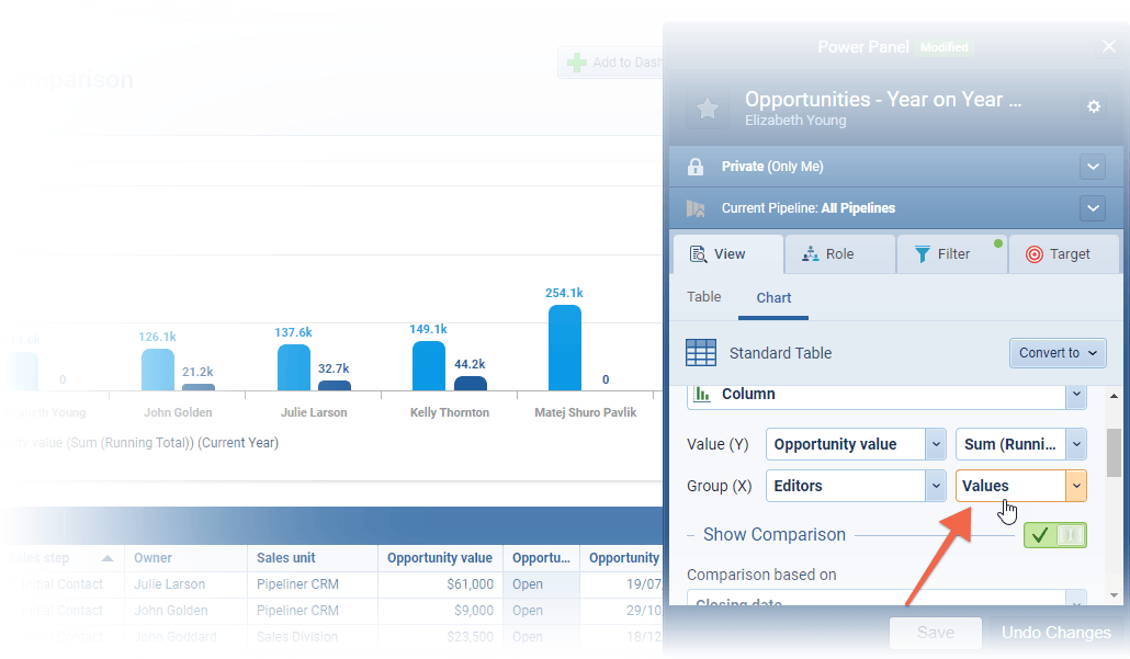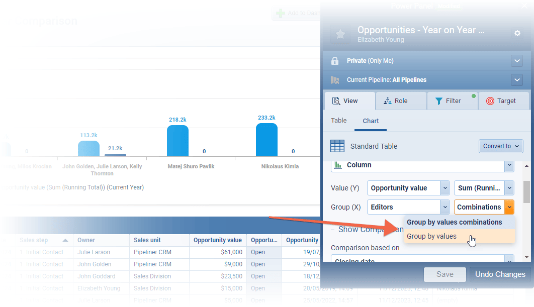 It is now possible to the user to change the grouping mode to “Group by values” to change to each instance of single values instead. This does, of course, mean that a single record — Opportunity, for example — may be counted more than once if it contains multiple values in the selected field — e.g. if it has multiple “Editors” assigned. ⤵