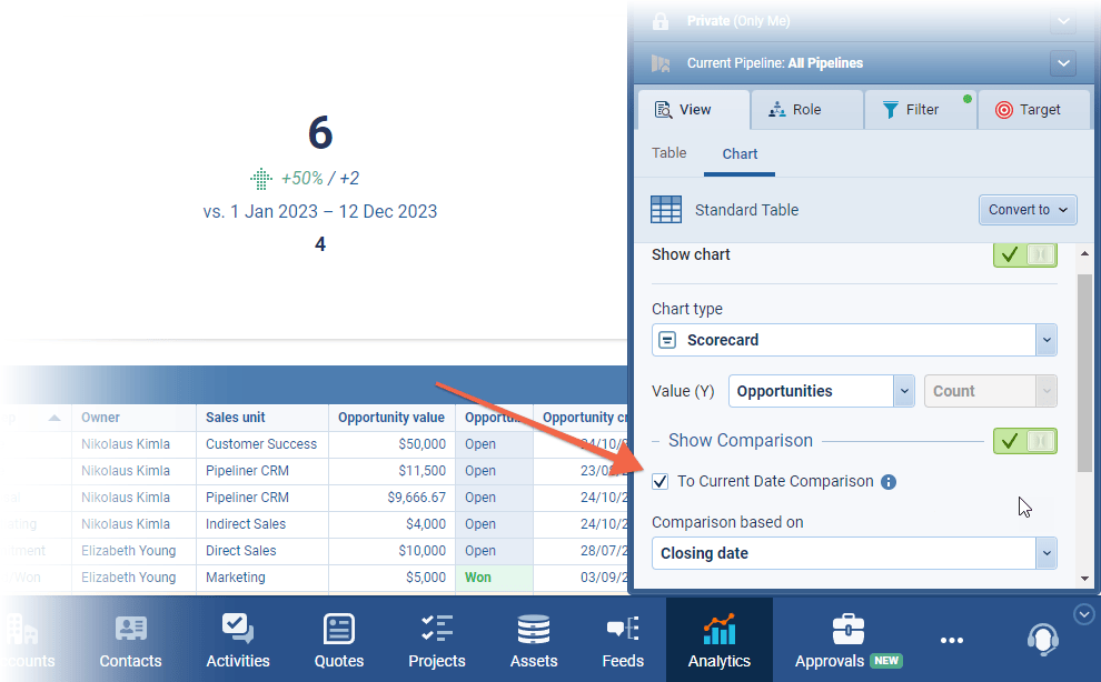If checked, the end date of the comparison period is changed to the current day. This option is also available for time periods on the X-axis for line, column and bar charts. ⤵