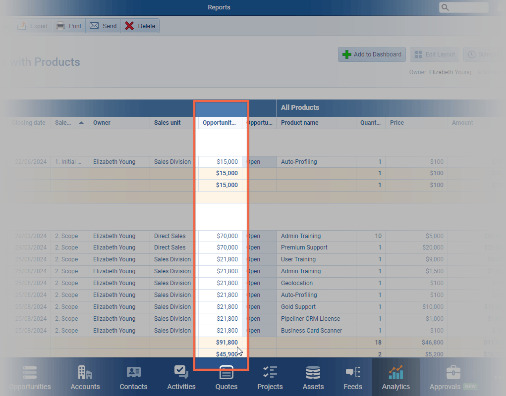 The issue where totals were counted more than once in a multi entity report has been fixed. For example, in an “Opportunity” report which includes “Product Line Items“, the “Opportunity Values” are now correctly totalled. ⤵