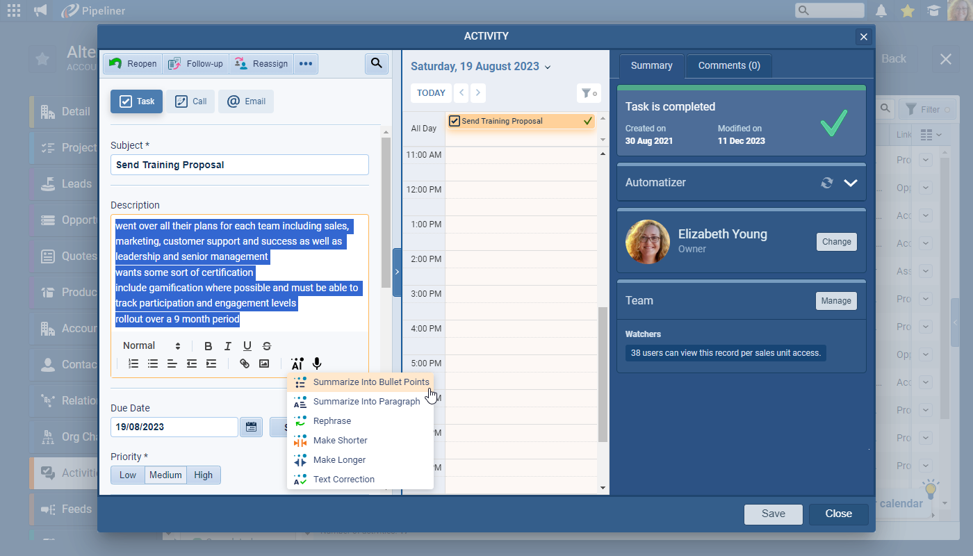 - “Summarize into Bullet Points” › the AI Assistant will process the selected text and the result will be summarized into bullet points