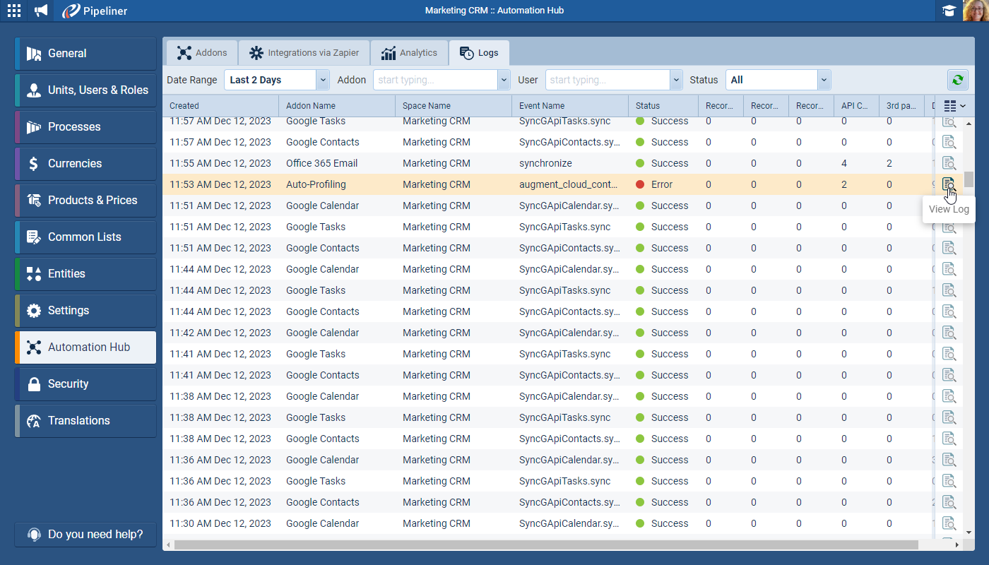 Click on “View Log” to see the specifics of each log run. This is extremely useful if you see any errors in the logs.
