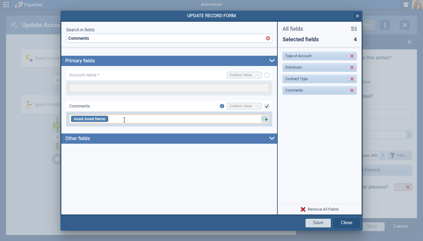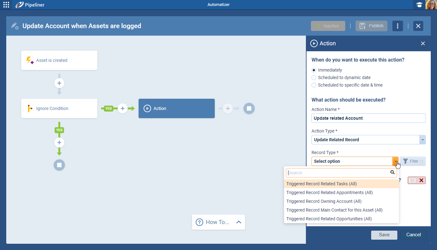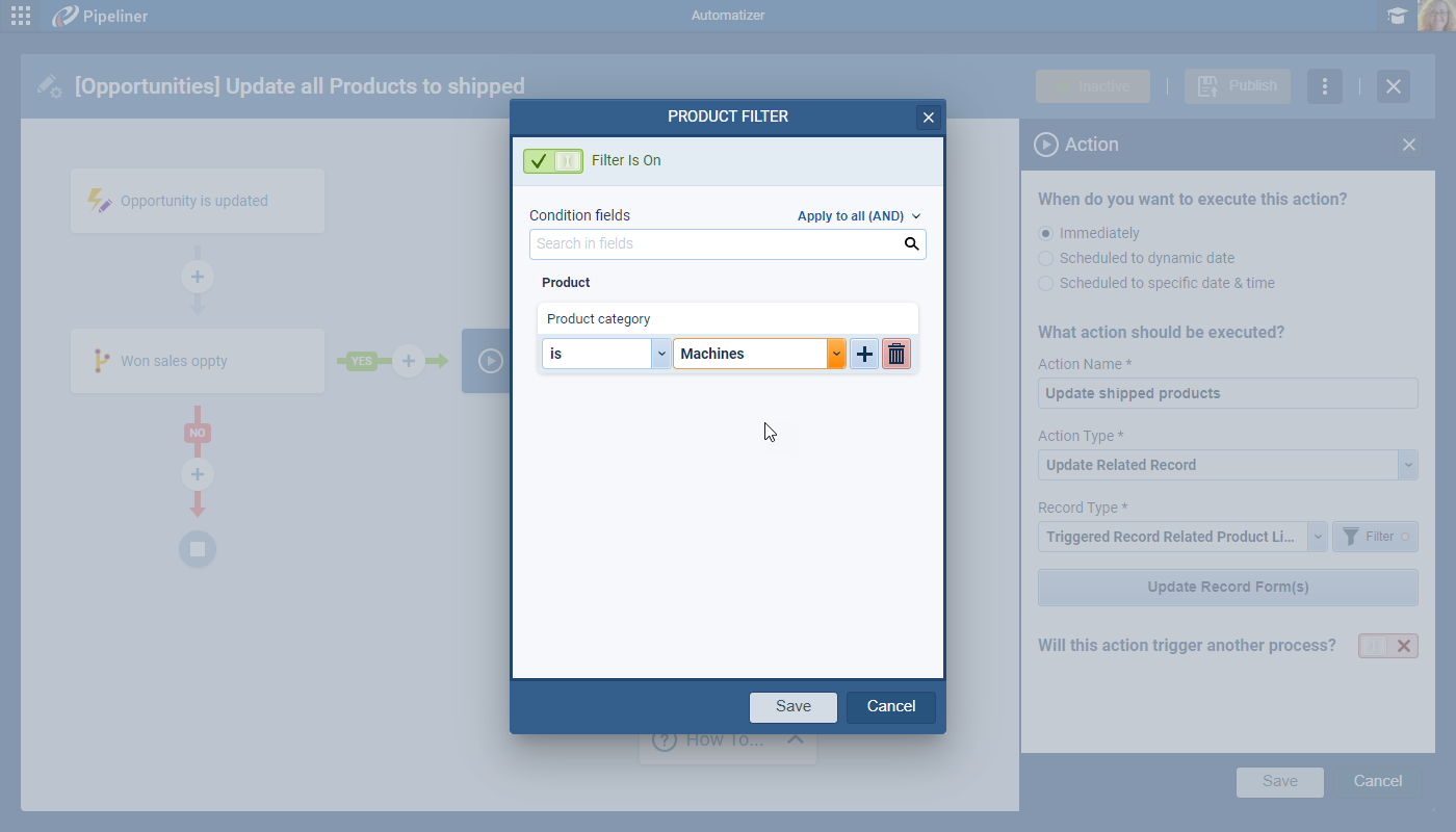 Users can now filter related records to be updated via an “Action” in an Automatizer process. Previously, the Action would update all related records of the selected type but users can now choose, for example, to update only certain types of Activity, specific ProductProduct Product refers to anything (an idea, item, service, process or information) that meets a need or a desire and is offered to a market, usually but not always at a price. Line Items or active Contacts. ⤵