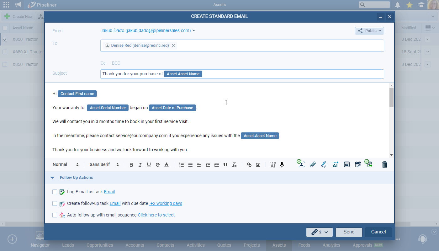 Users can send emails to “Accounts & Contacts” and link them to Custom Entities or send emails to all accountAccount Account refers to a record of primary and background information about an individual or corporate customer, including contact data, preferred services, and transactions with your company./contact lookups located on the custom entity or any other entity. Emails can also be personalized by any Custom Entity. ⤵