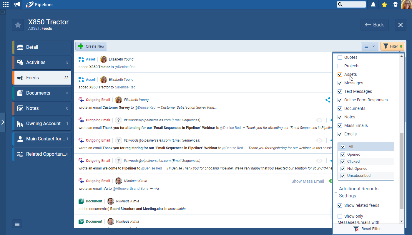 Custom Entities now have their own Feeds tab which works in the same way as it does for system entities. Feed items will be visible on the Custom Entity’s “Feeds” tab as well as on related records. Feed items can also be filtered. ⤵