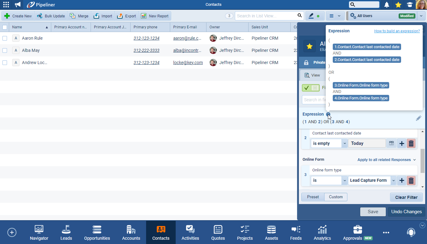 Users create custom expressions by combining field numbers (note that each field has a number that can be referenced in the expression) with operators “AND” or “OR” and parentheses. Additional fields can be added to the filter but also must be explicitly included in the expression to affect the result. Fields highlighted in grey are not part of the expression, so are ignored when displaying the results. ⤵