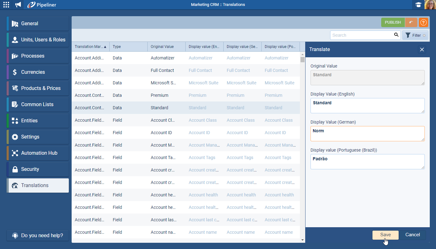 Admins can also define new “Translation Markers” in Portuguese from the “Translations” tab in the “Admin Module“. ⤵