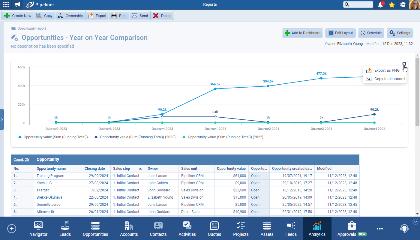 It is now easy to export graphs from dashboards and reports to add to a presentation, for example, or to paste into an email as an image. All chart types can now be copied to clipboard or exported as “.PNG“. ⤵