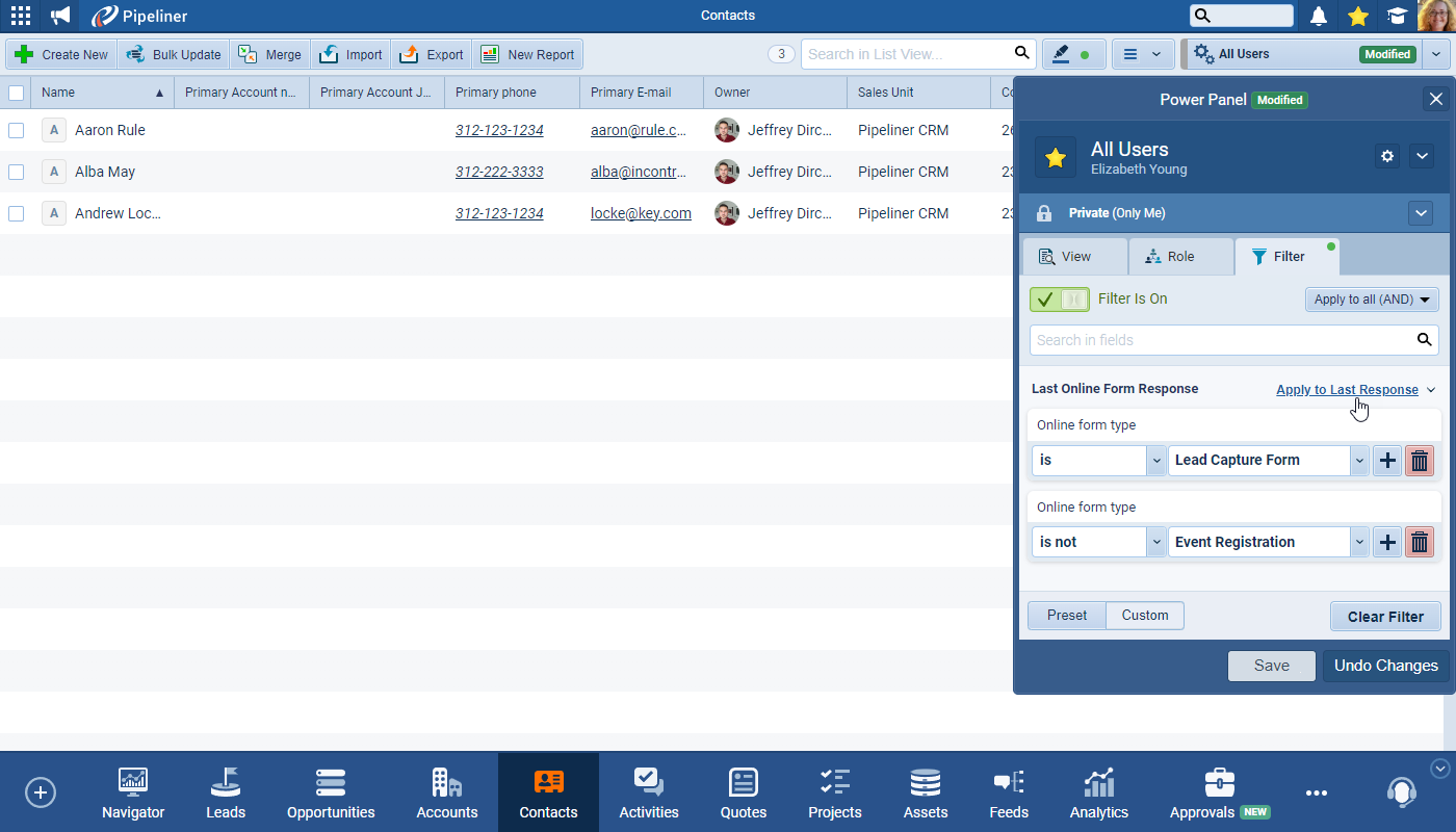 Data filtering has also been improved, as a field can be included in a filter more than once. As an example, this will allows users to filter “multi select checkbox” values more effectively by including one option but excluding another or by filtering a specific value in a field but also where that field is empty. ⤵