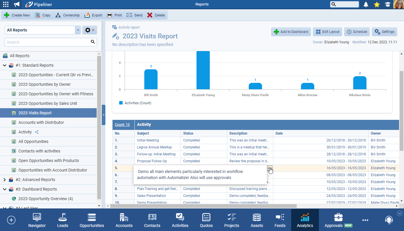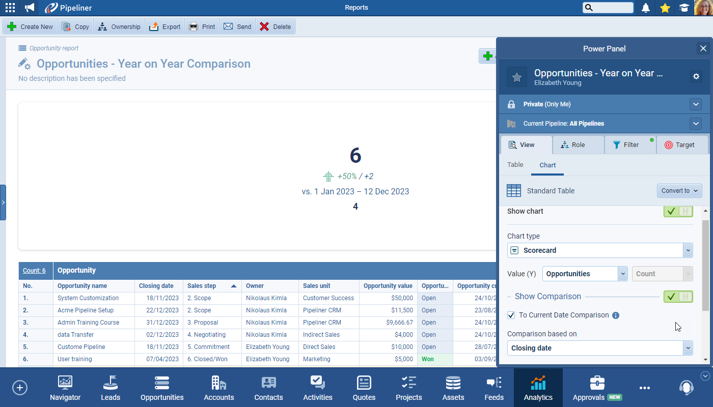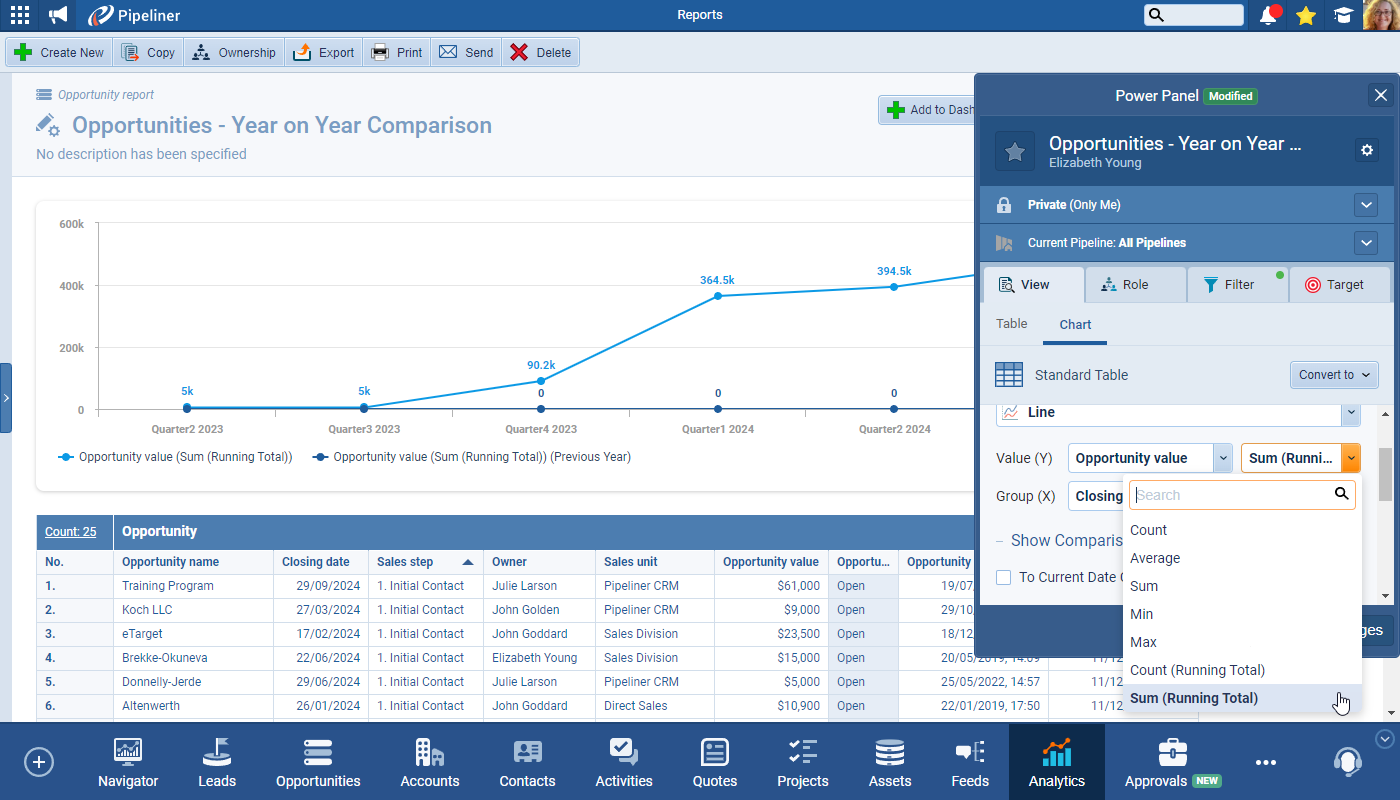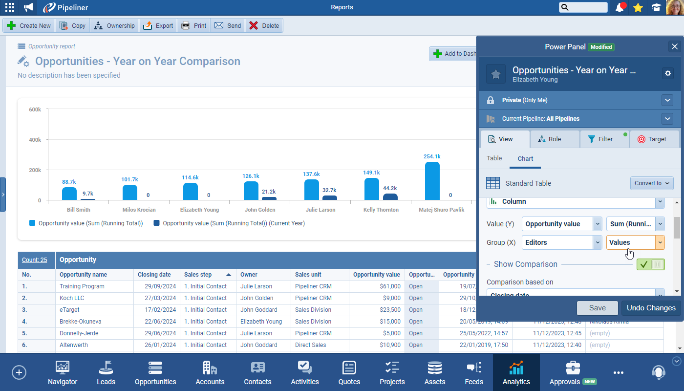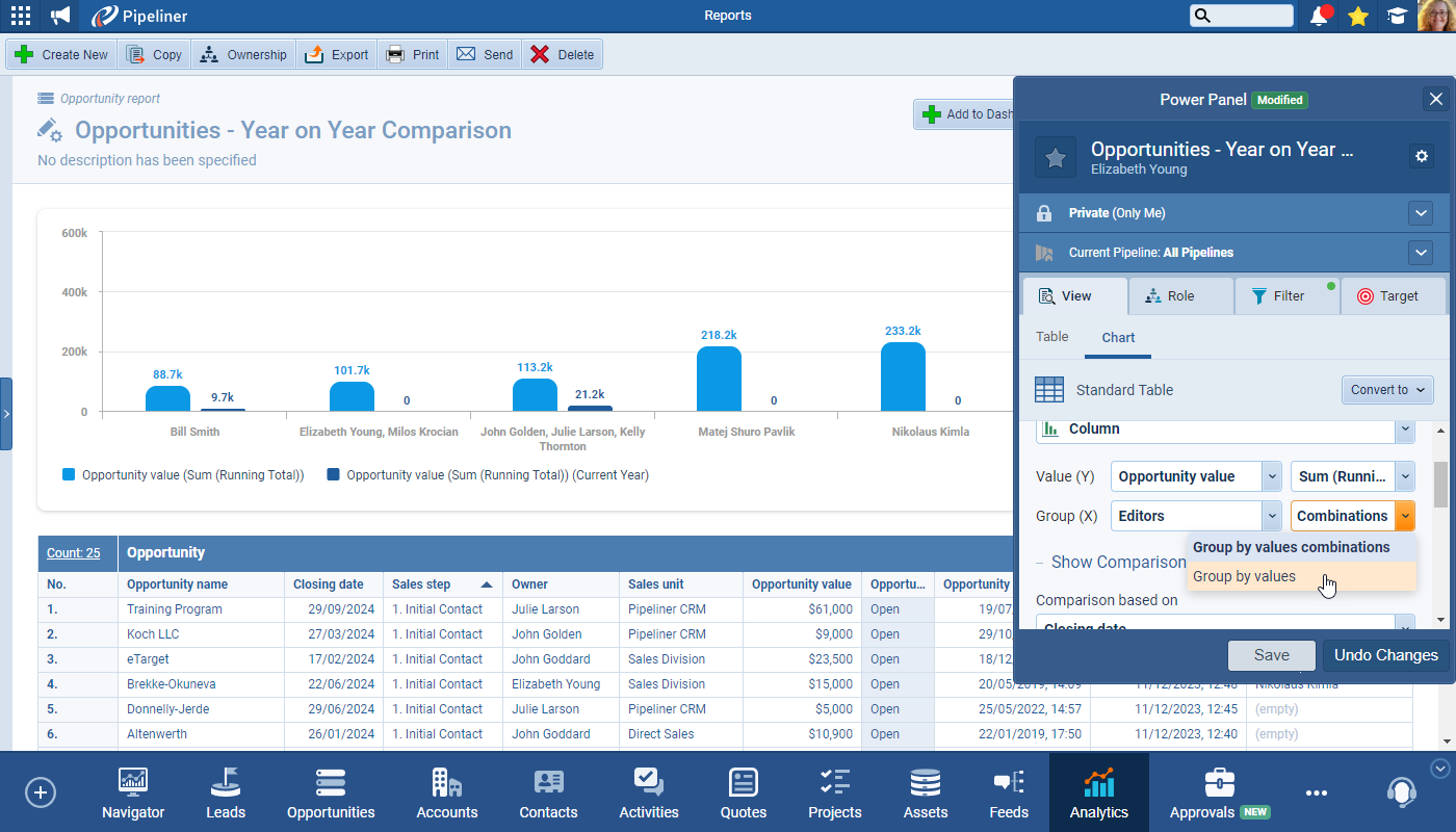 It is now possible to the user to change the grouping mode to “Group by values” to change to each instance of single values instead. This does, of course, mean that a single record — Opportunity, for example — may be counted more than once if it contains multiple values in the selected field — e.g. if it has multiple “Editors” assigned. ⤵