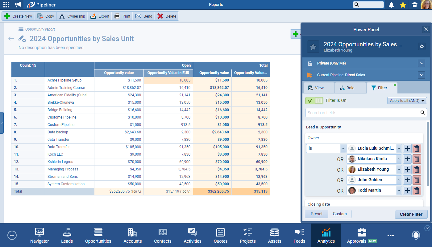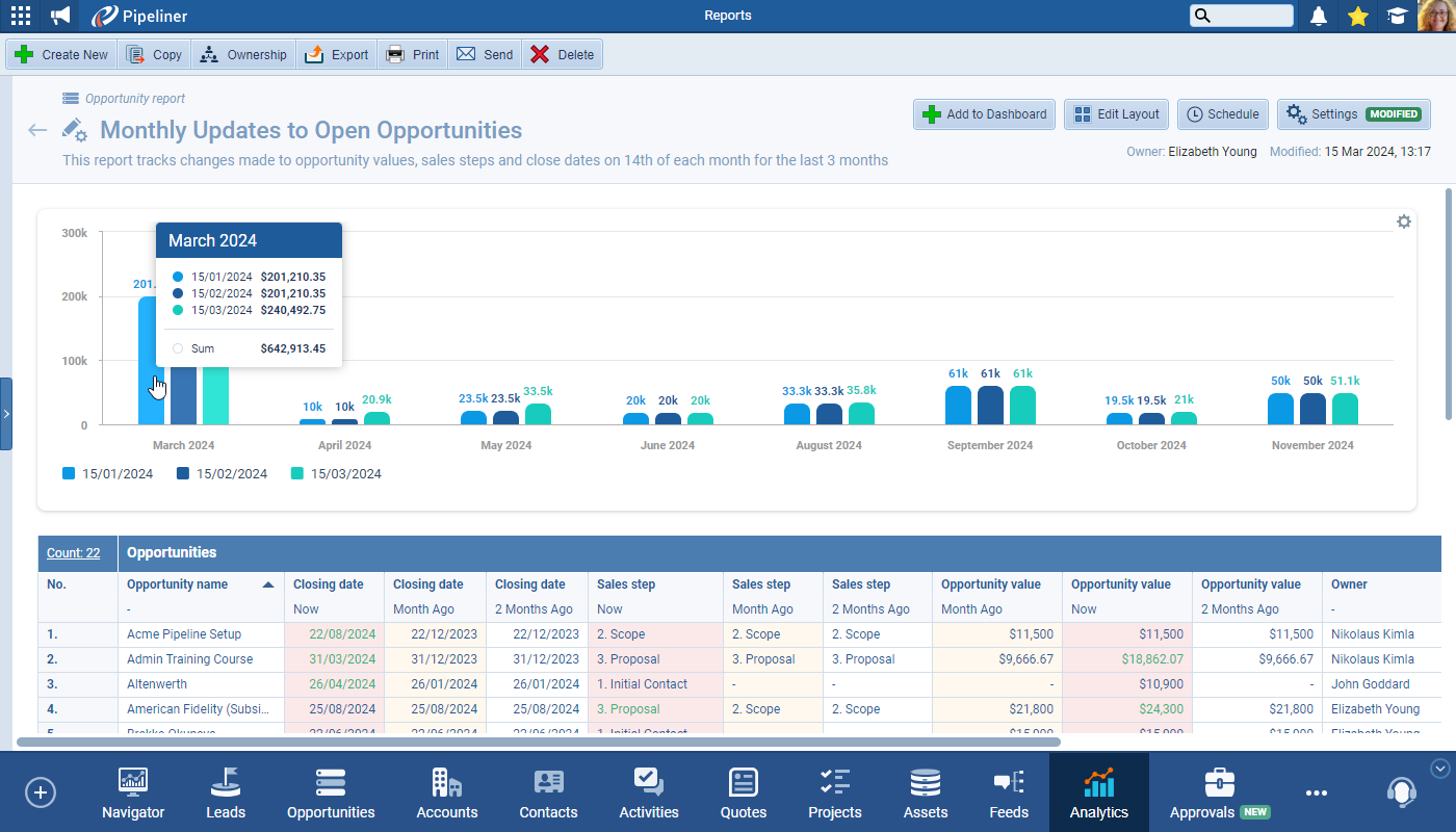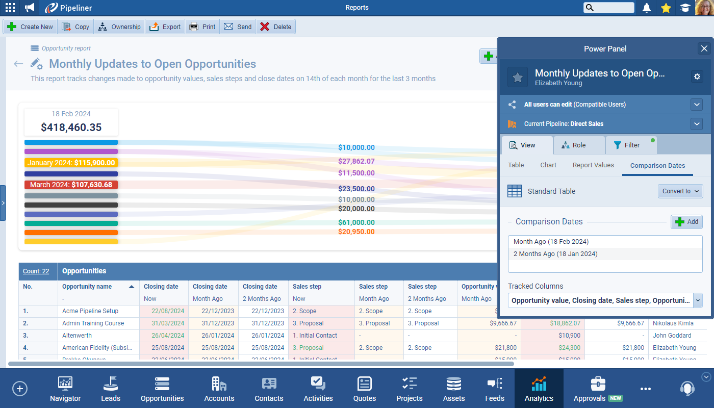 Use this type of report to answer such questions as “What’s the current value of our open opportunities as compared to their value last month › is it increasing or decreasing?” ⤵